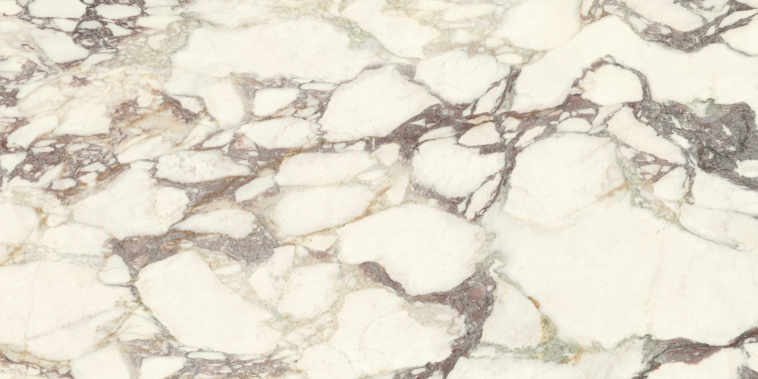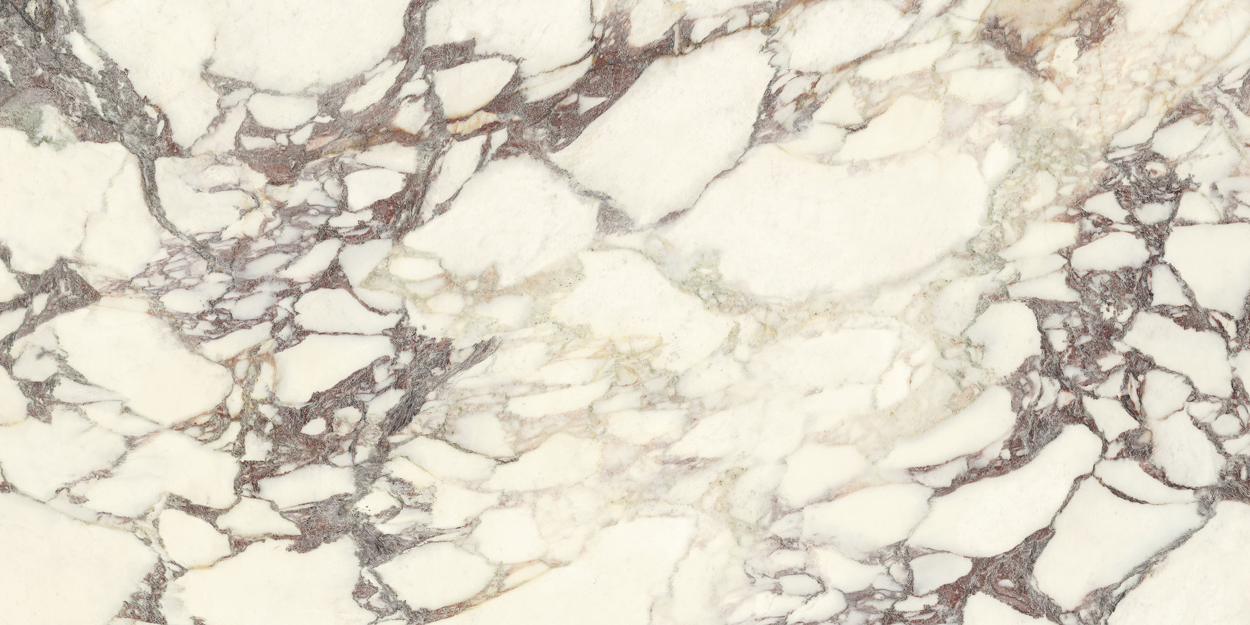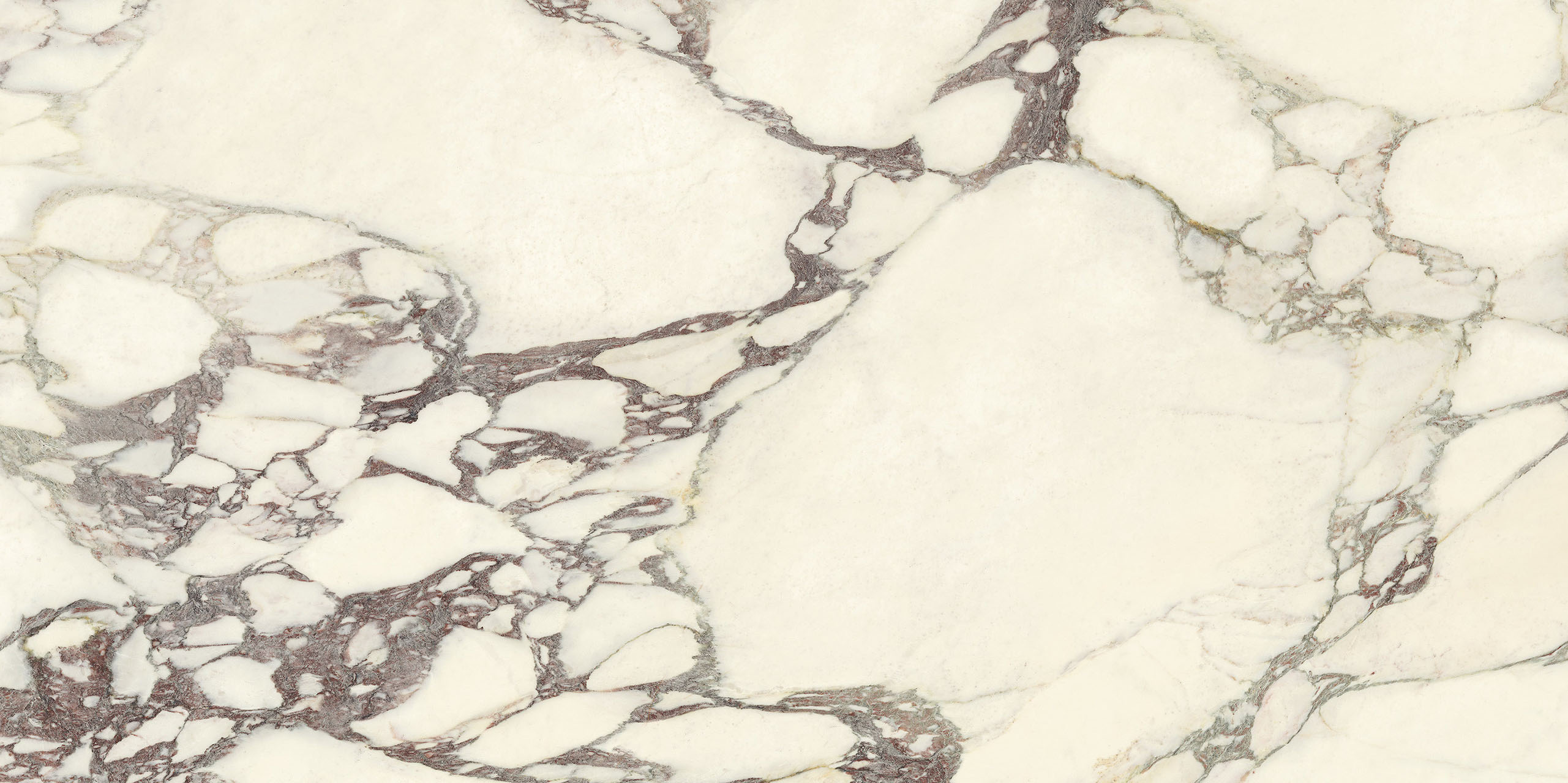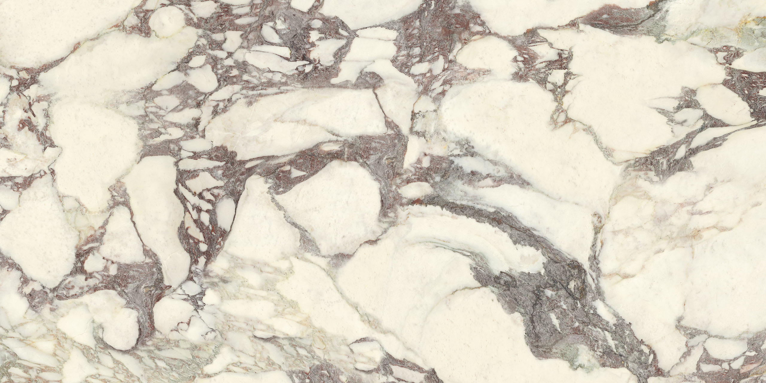 La struttura ampiamente venata e la sua impronta nobile rimandano ad antichi splendori. Il legante, dai classici toni violacei, disegna sagome a schema libero sul fondo bianco caldo, mentre alle sfumature verdi o rosate mescola guizzi quasi dorati. La policromia è perfettamente compiuta. Disponibile sia in formati classici che Maximum
