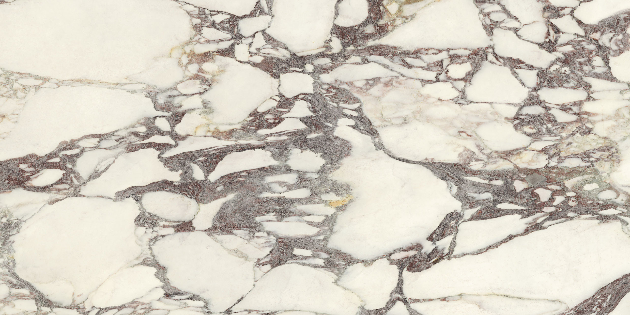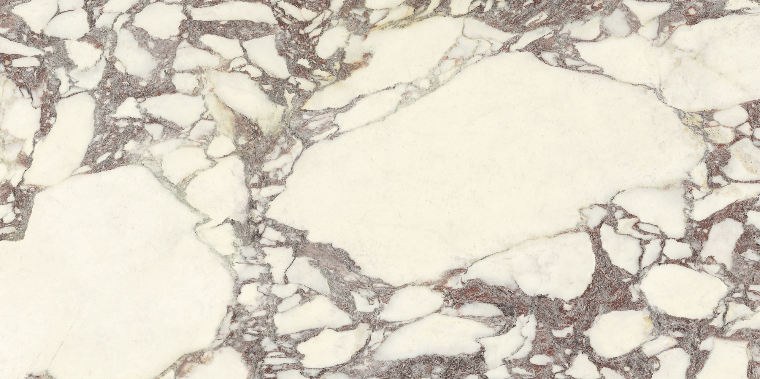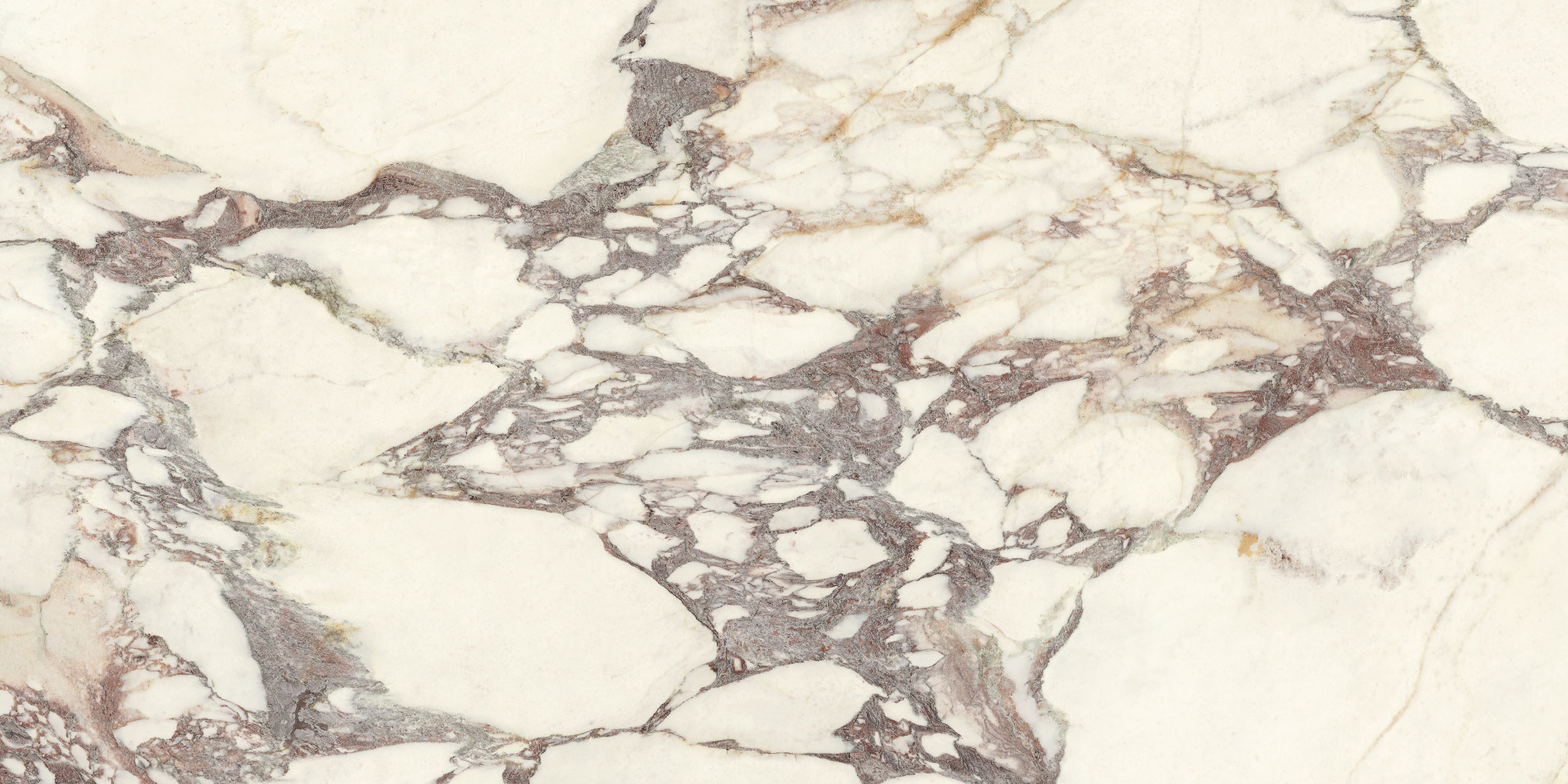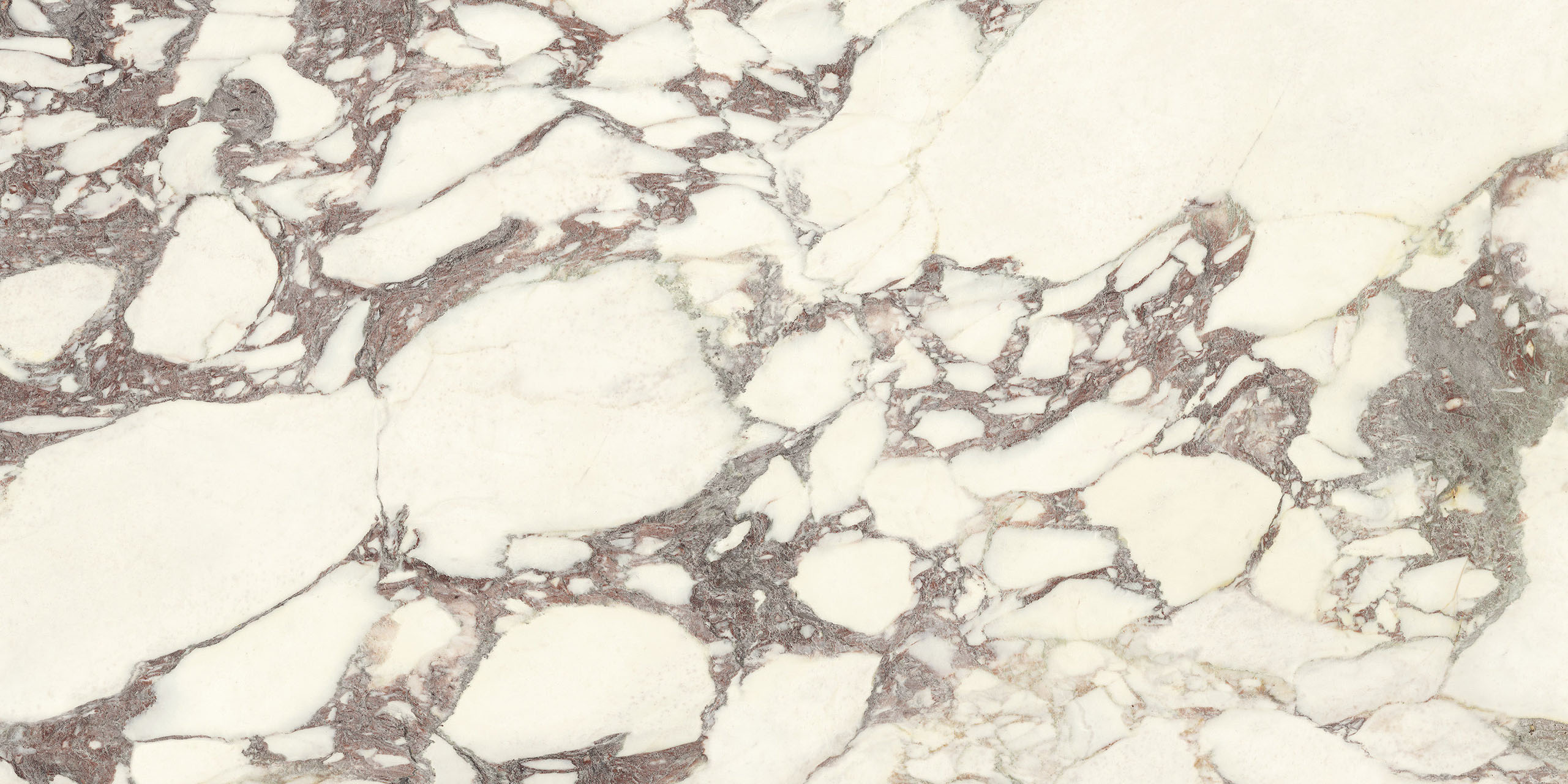 La struttura ampiamente venata e la sua impronta nobile rimandano ad antichi splendori. Il legante, dai classici toni violacei, disegna sagome a schema libero sul fondo bianco caldo, mentre alle sfumature verdi o rosate mescola guizzi quasi dorati. La policromia è perfettamente compiuta. Disponibile sia in formati classici che Maximum