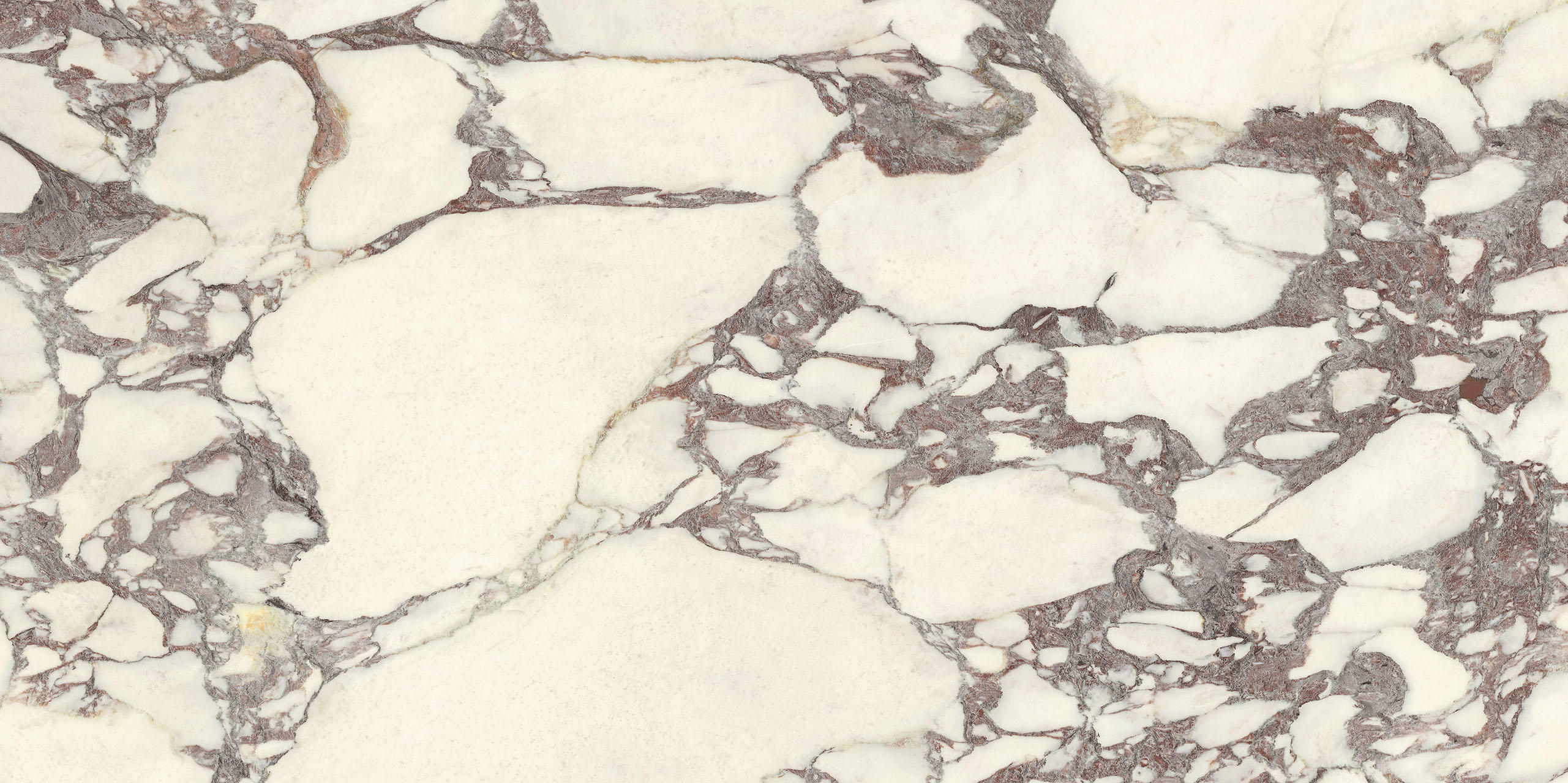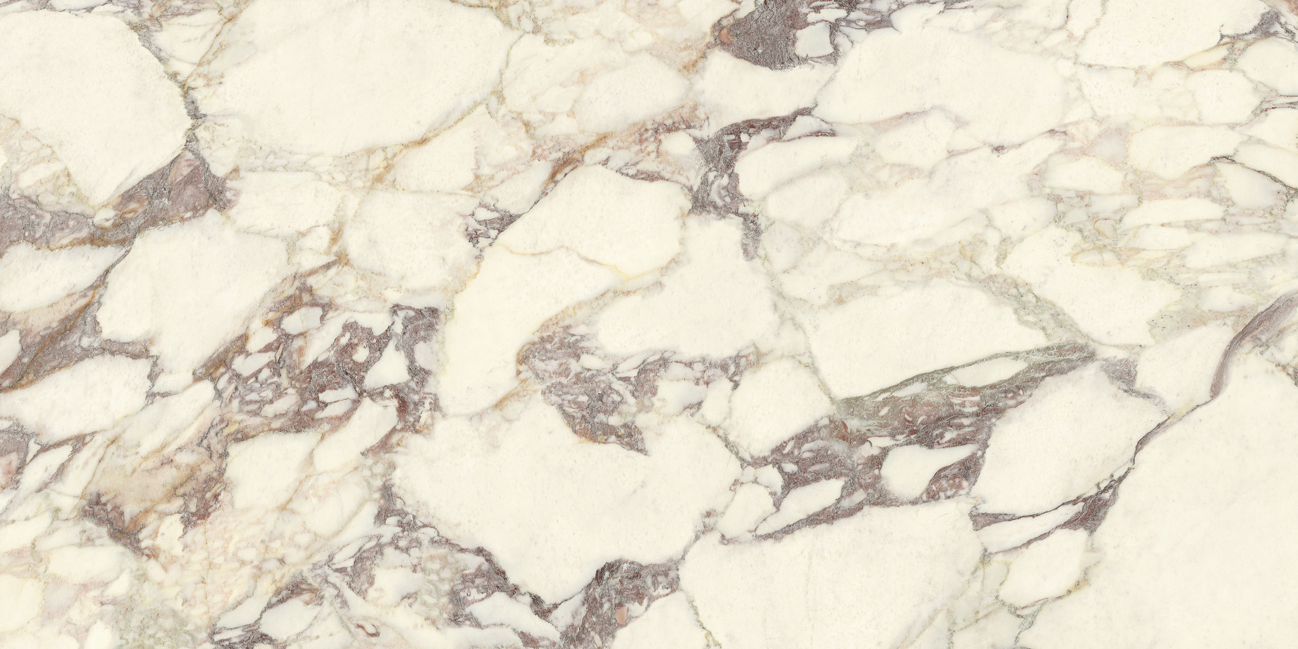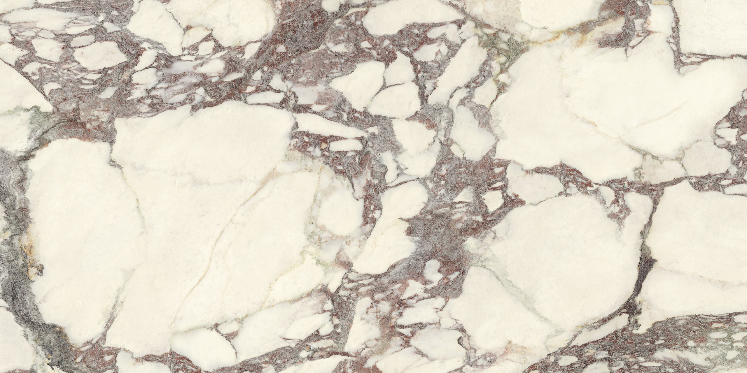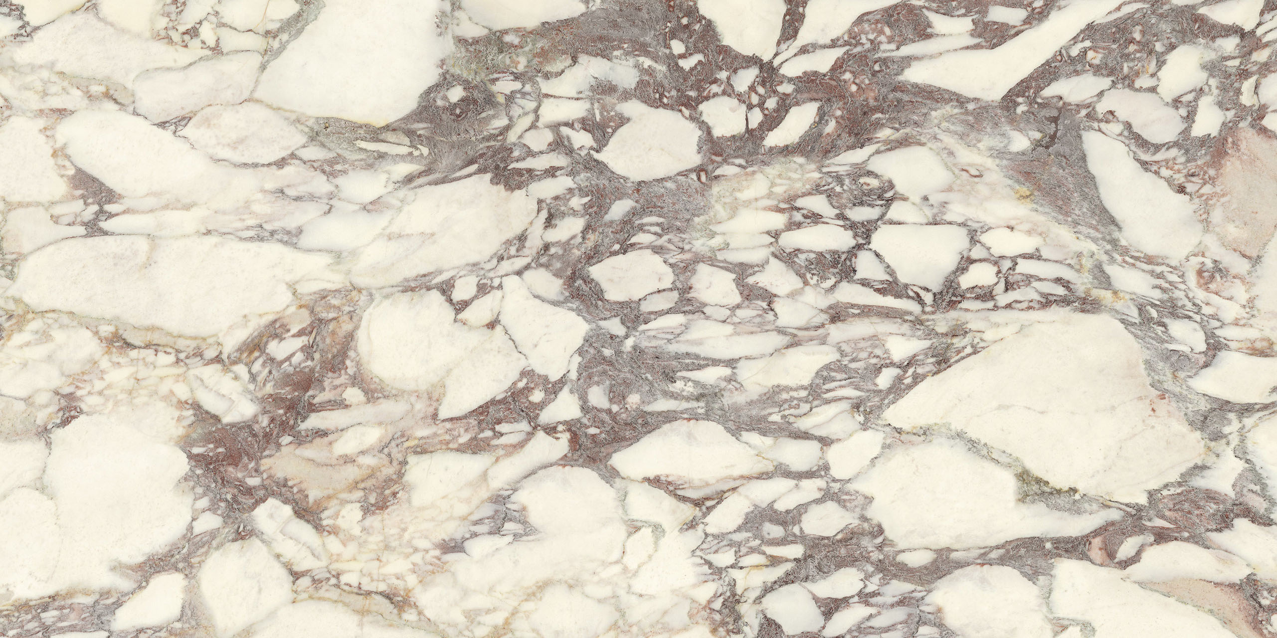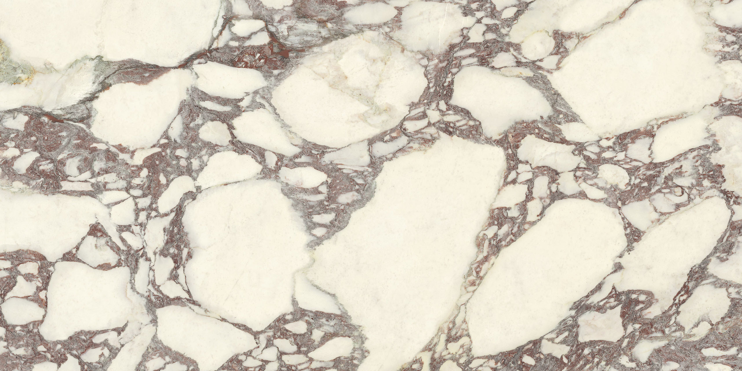 La struttura ampiamente venata e la sua impronta nobile rimandano ad antichi splendori. Il legante, dai classici toni violacei, disegna sagome a schema libero sul fondo bianco caldo, mentre alle sfumature verdi o rosate mescola guizzi quasi dorati. La policromia è perfettamente compiuta. Disponibile sia in formati classici che Maximum