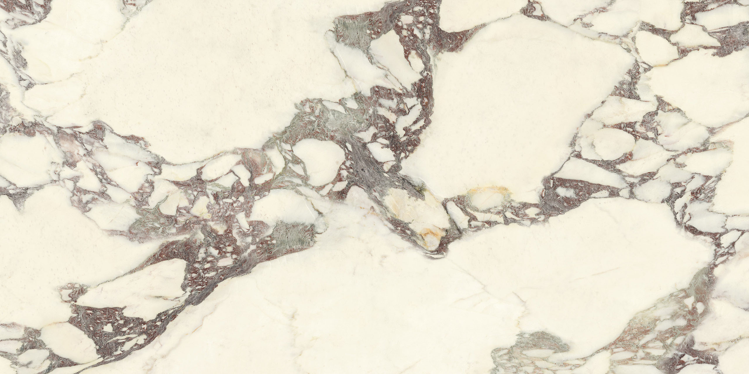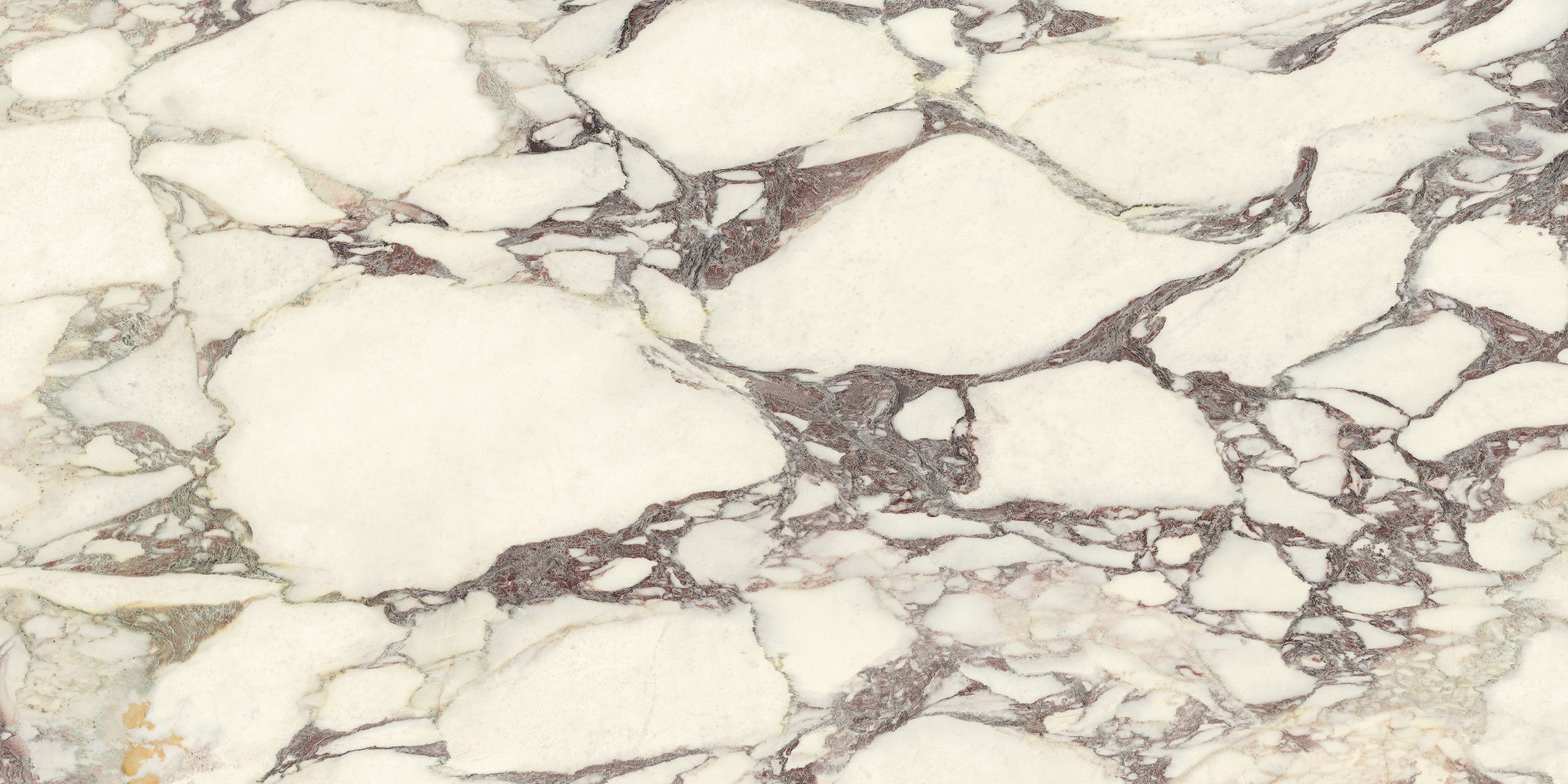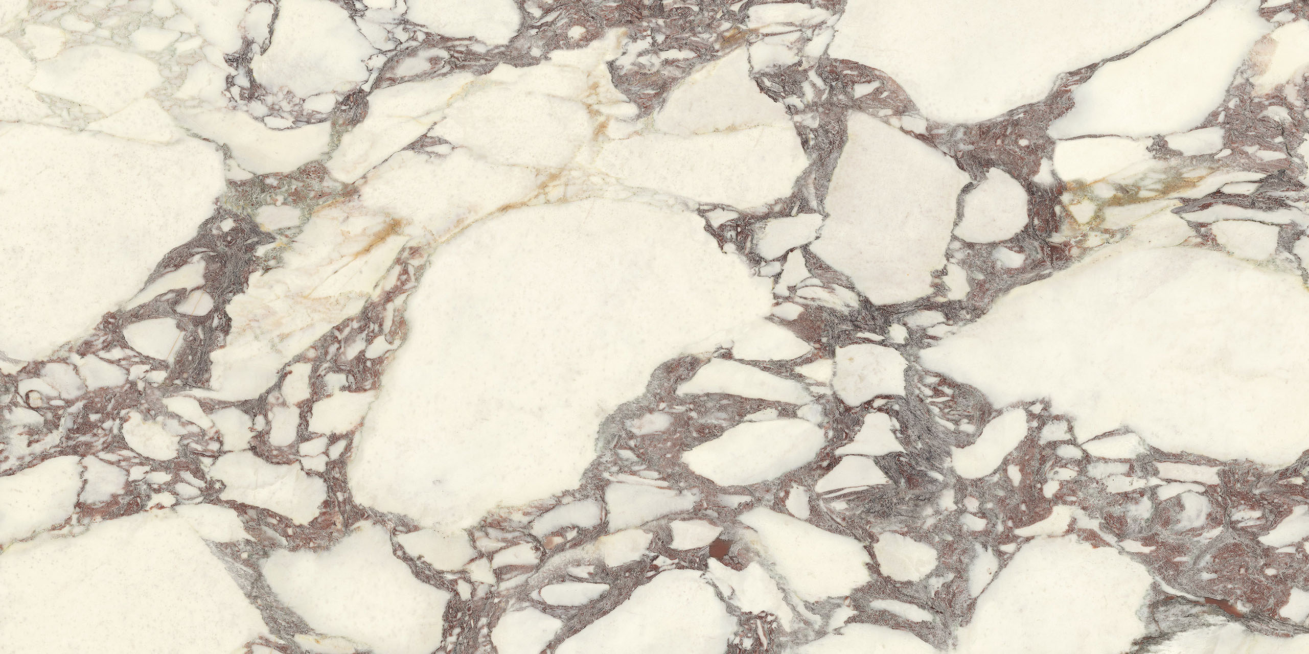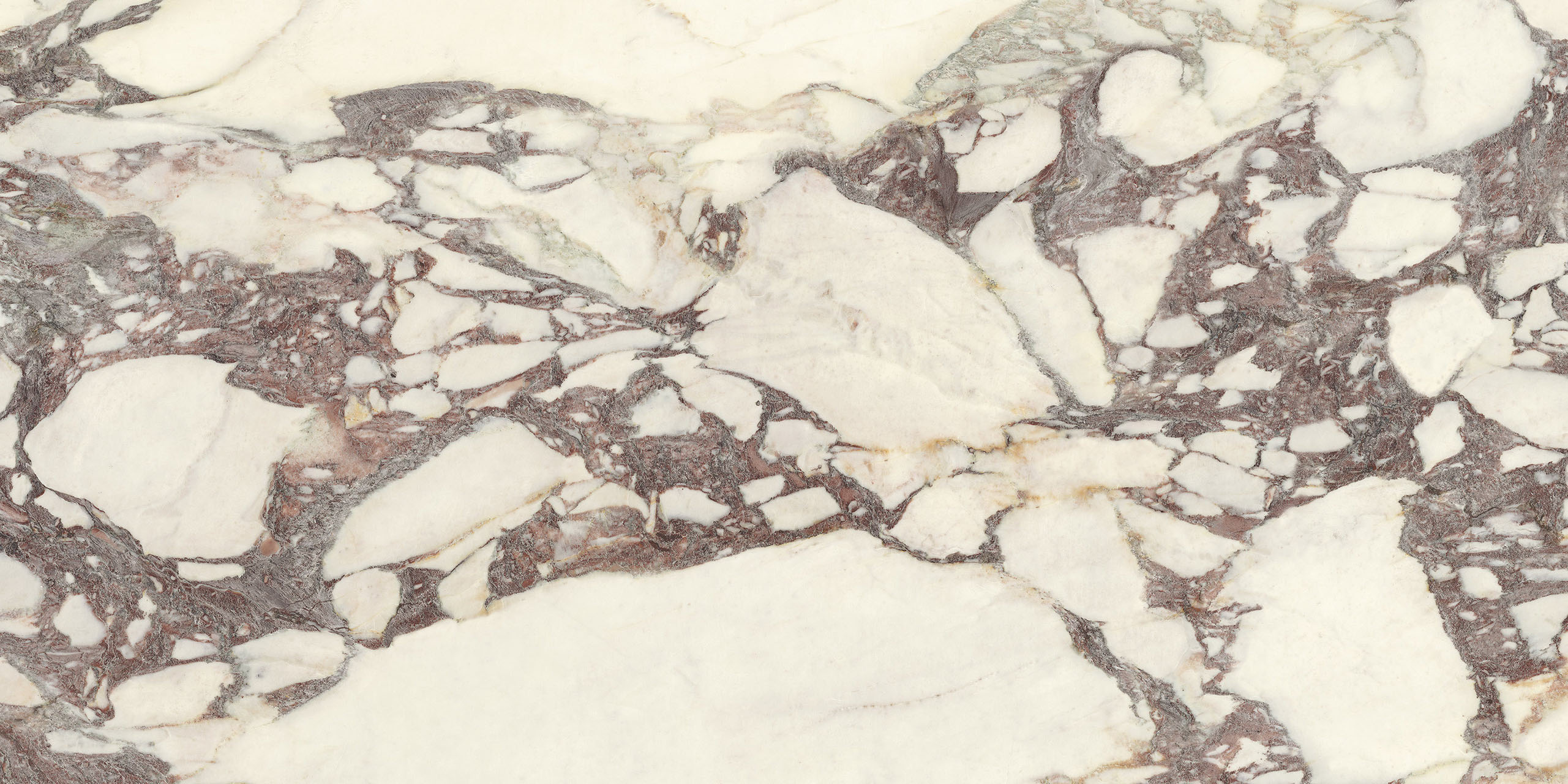 La struttura ampiamente venata e la sua impronta nobile rimandano ad antichi splendori. Il legante, dai classici toni violacei, disegna sagome a schema libero sul fondo bianco caldo, mentre alle sfumature verdi o rosate mescola guizzi quasi dorati. La policromia è perfettamente compiuta. Disponibile sia in formati classici che Maximum