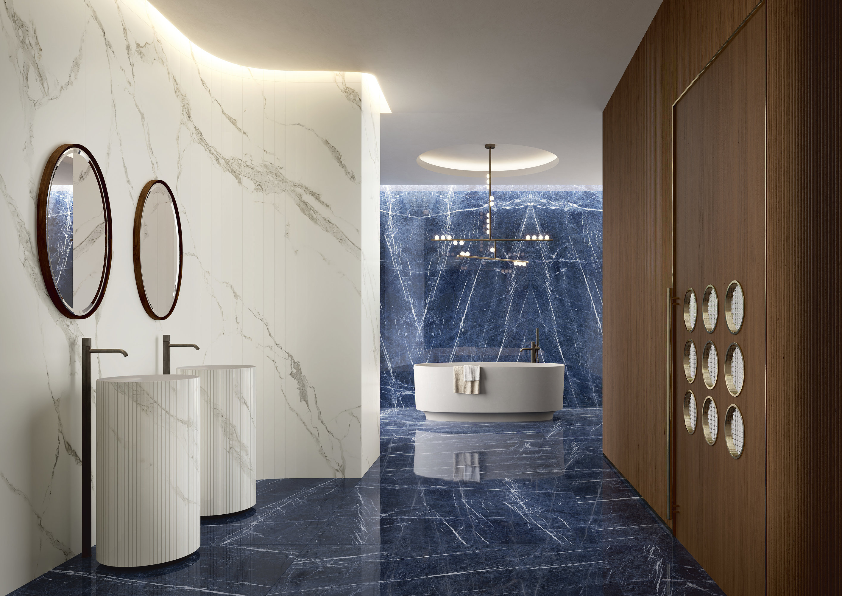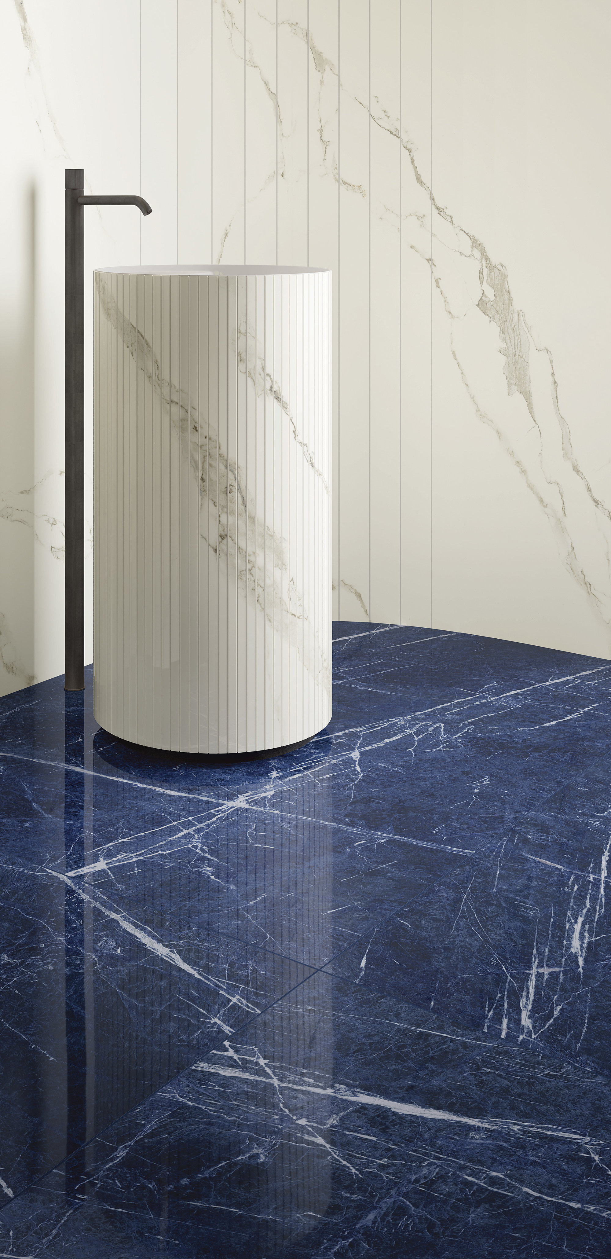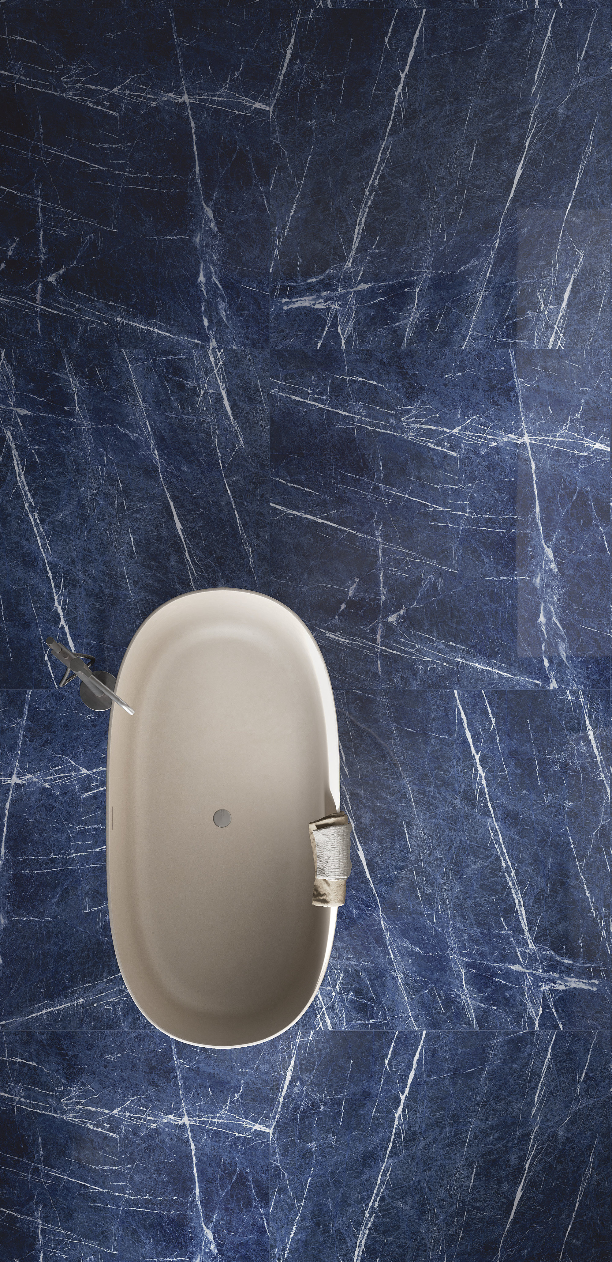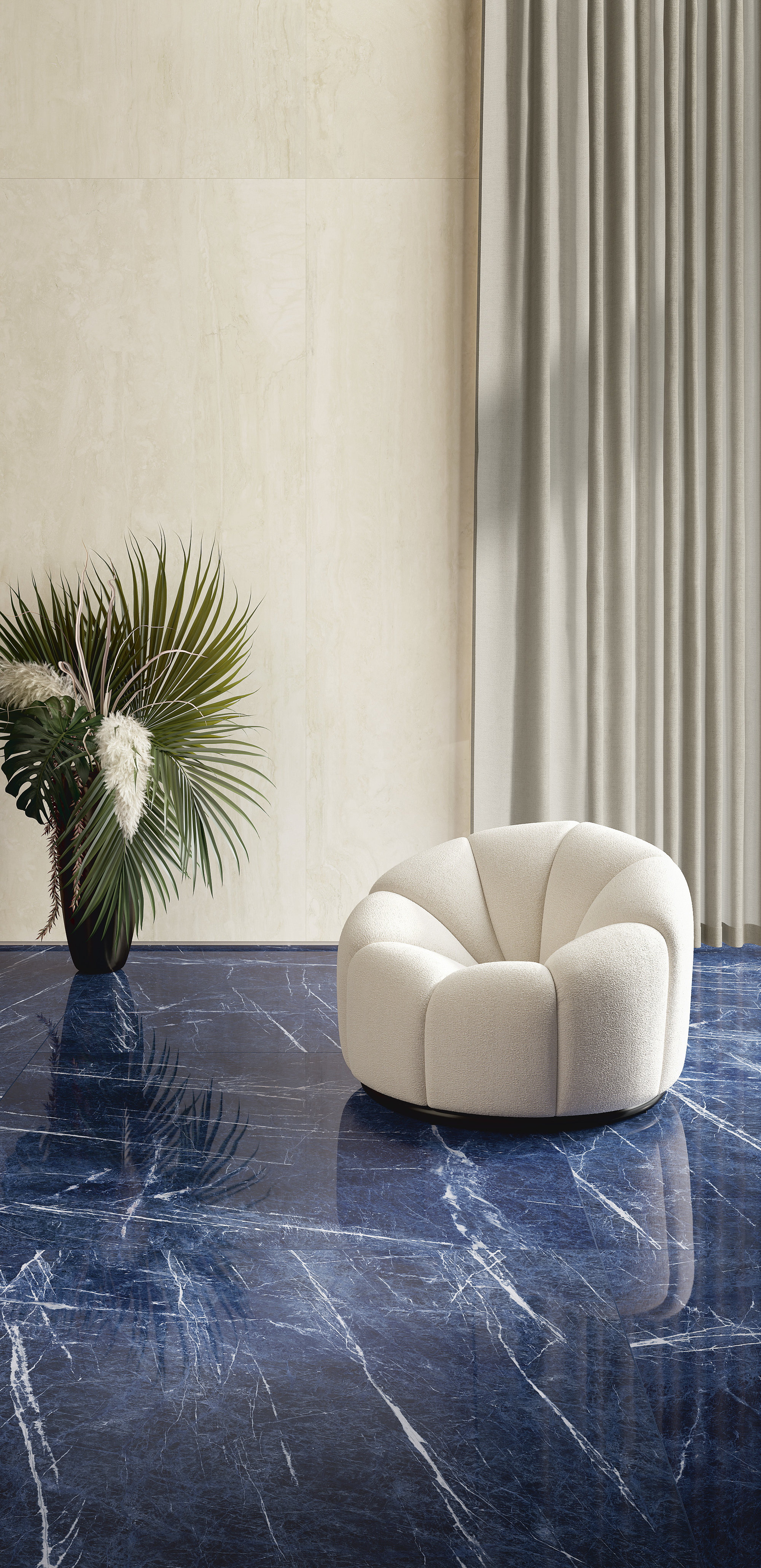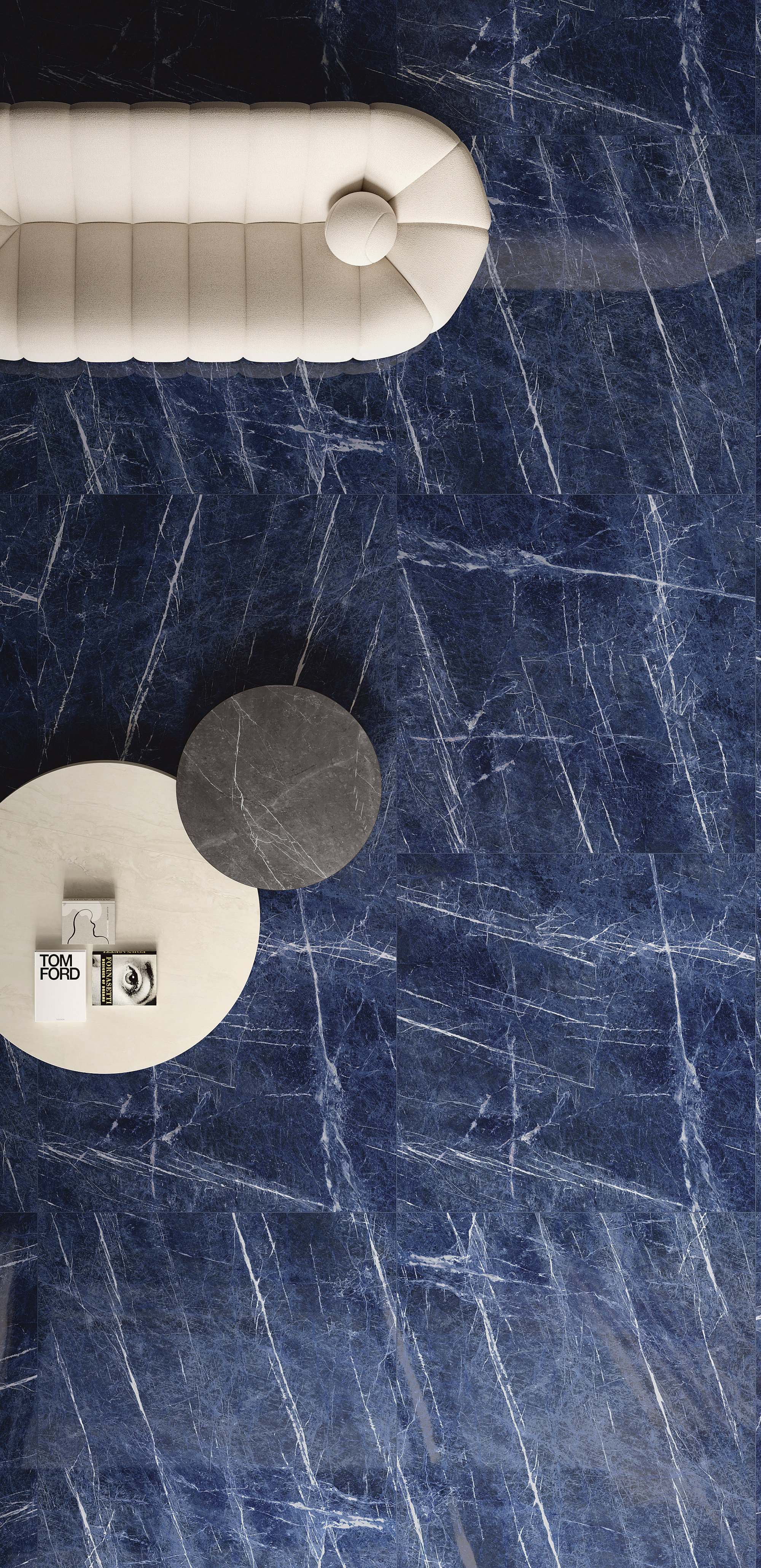Questa superficie in gres porcellanato effetto marmo presenta una base blu intenso, arricchita da venature bianche e sottili, che creano un contrasto raffinato e dinamico. Le venature, irregolari e luminose, evocano l’aspetto del marmo pregiato, conferendo agli ambienti un'atmosfera ricercata e contemporanea.Disponbile anche in versione "macchi aperta" (book-match).