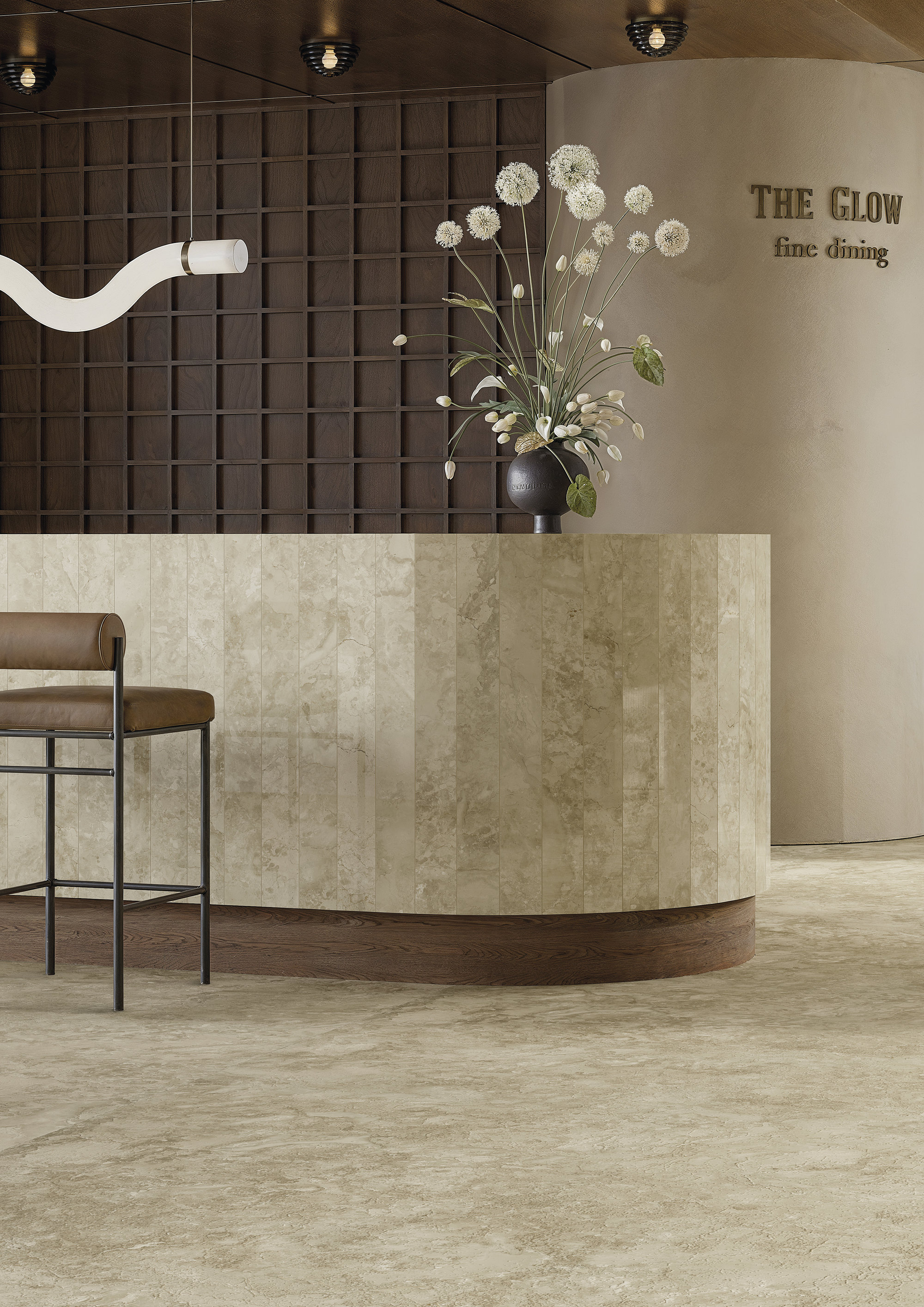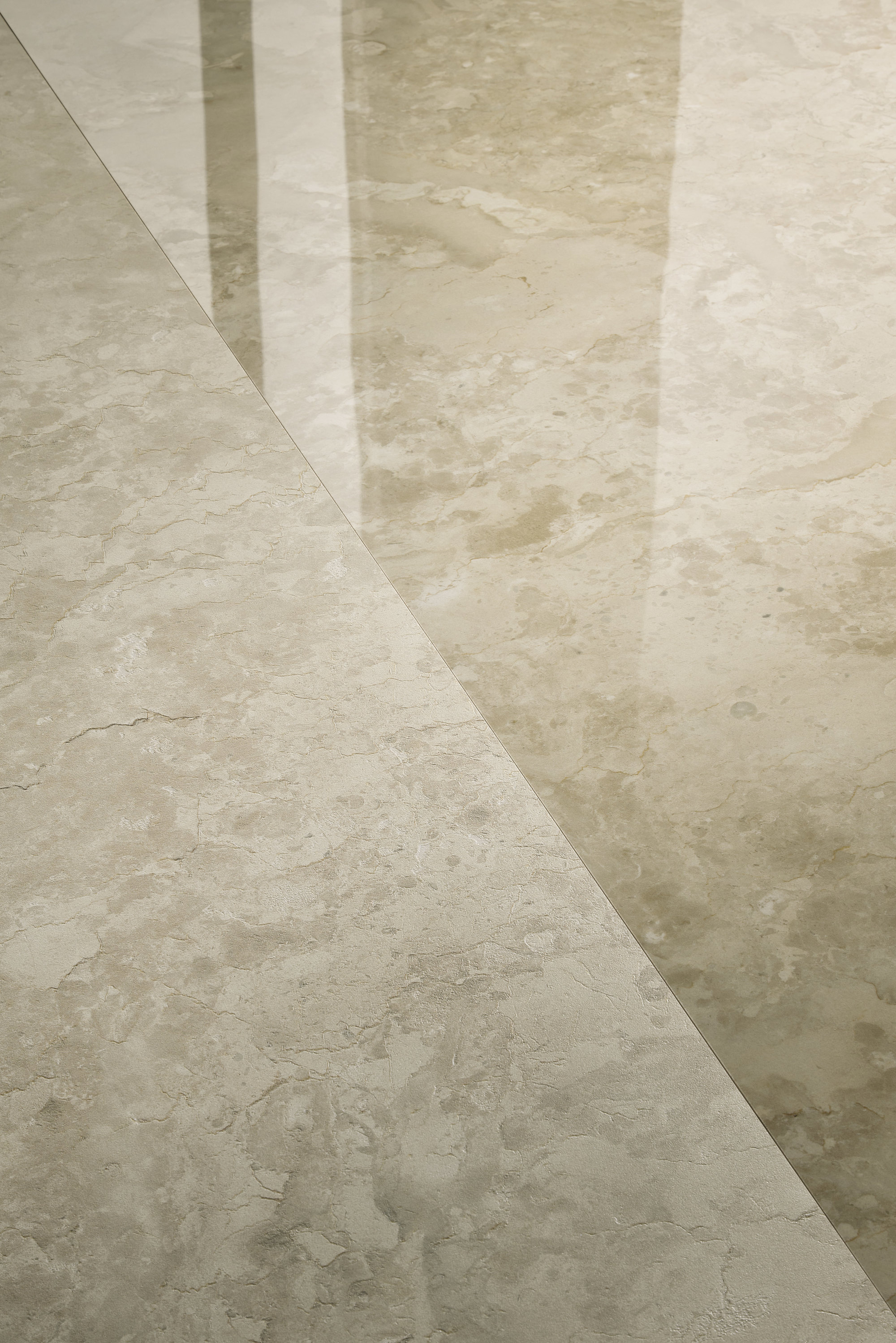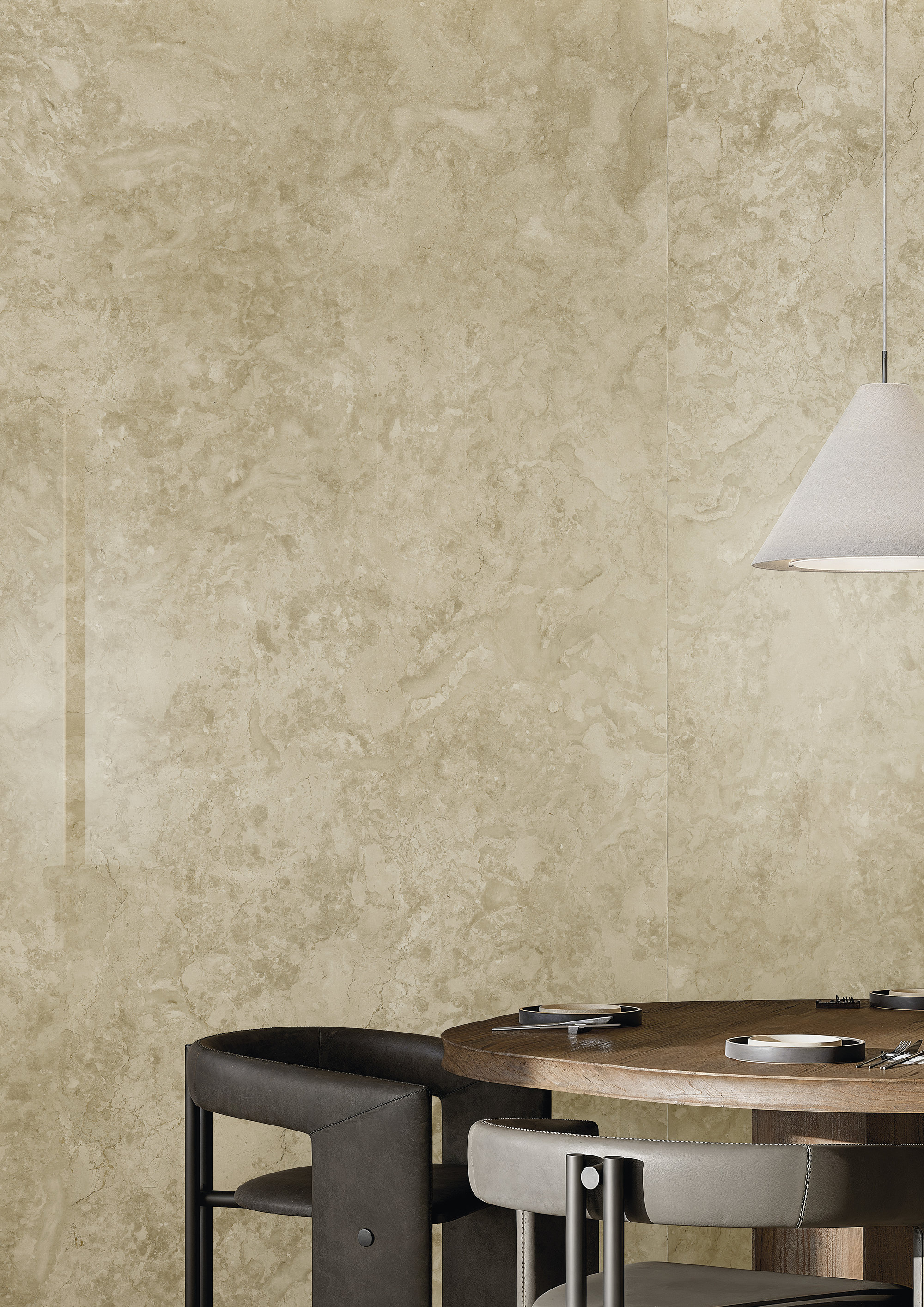 Fondo beige solcato da una trama di fioriture sottili, ispirata ai marmi calcarei italiani. Una superficie che combina sobrietà e movimento grazie alle sue trame intricate e irregolari, con un risultato equilibrato e naturale. Fiorenza è disponibile nella finitura Natural, opaca e materica, con grafica e rilievo perfettamente corrispondenti e nella finitura Polished extra-lucida, che ne valorizza la profondità cromatica e la ricchezza del disegno. Questa superficie in formato Maximum viene realizzate con tecnologia a base acqua: resa estetica eccellente, alta definizione dell’immagine ed effetto materico, all’insegna della sostenibilità ambientale.