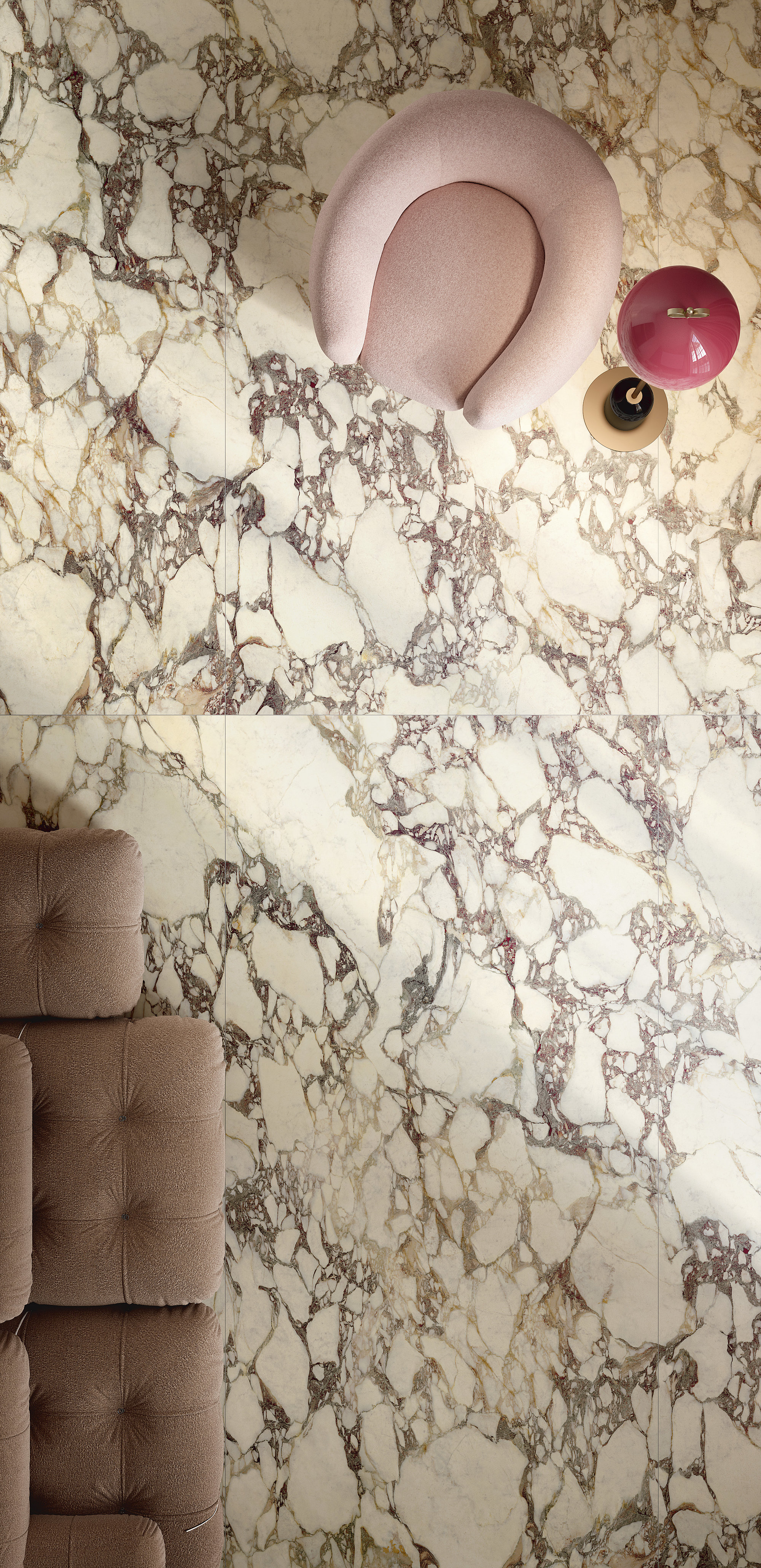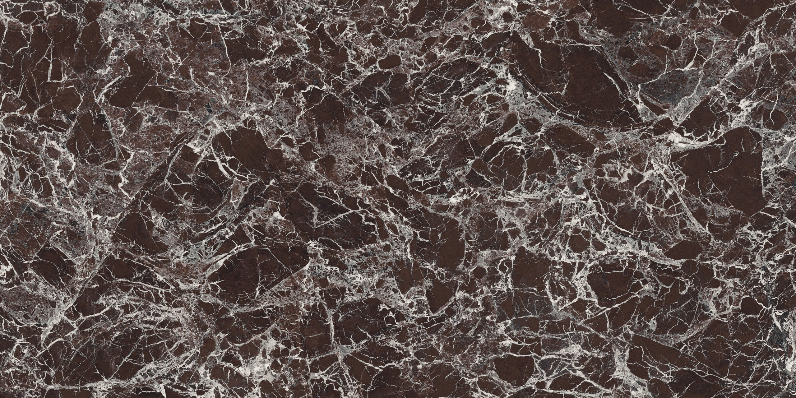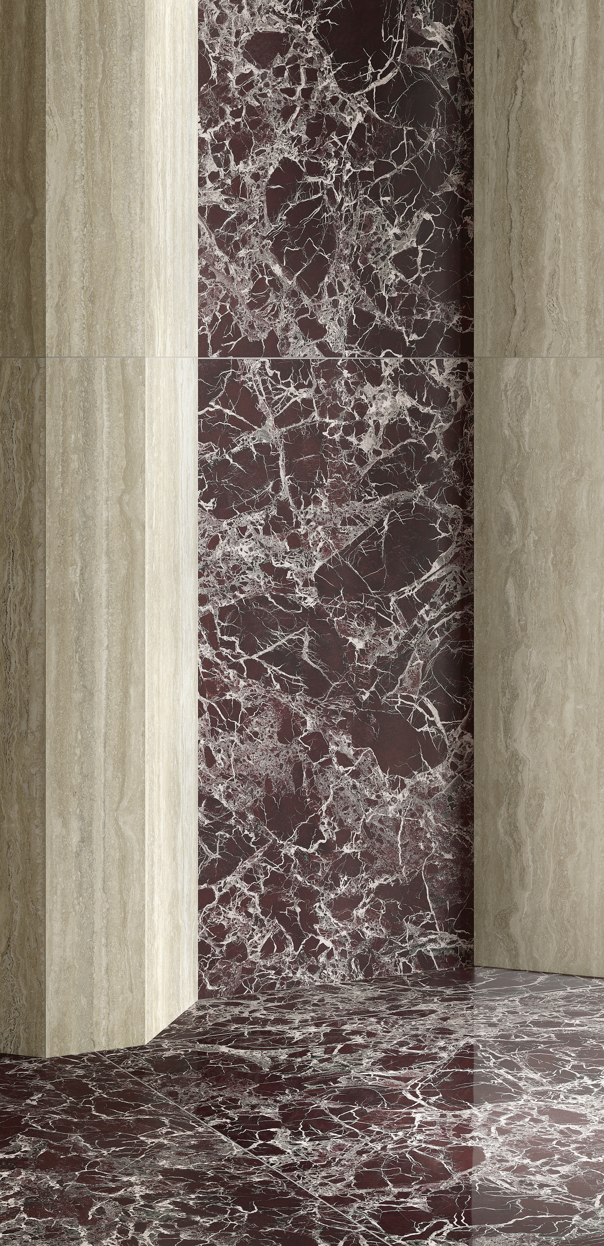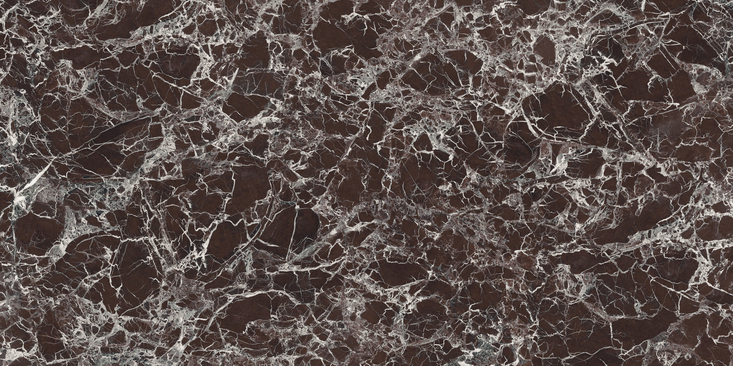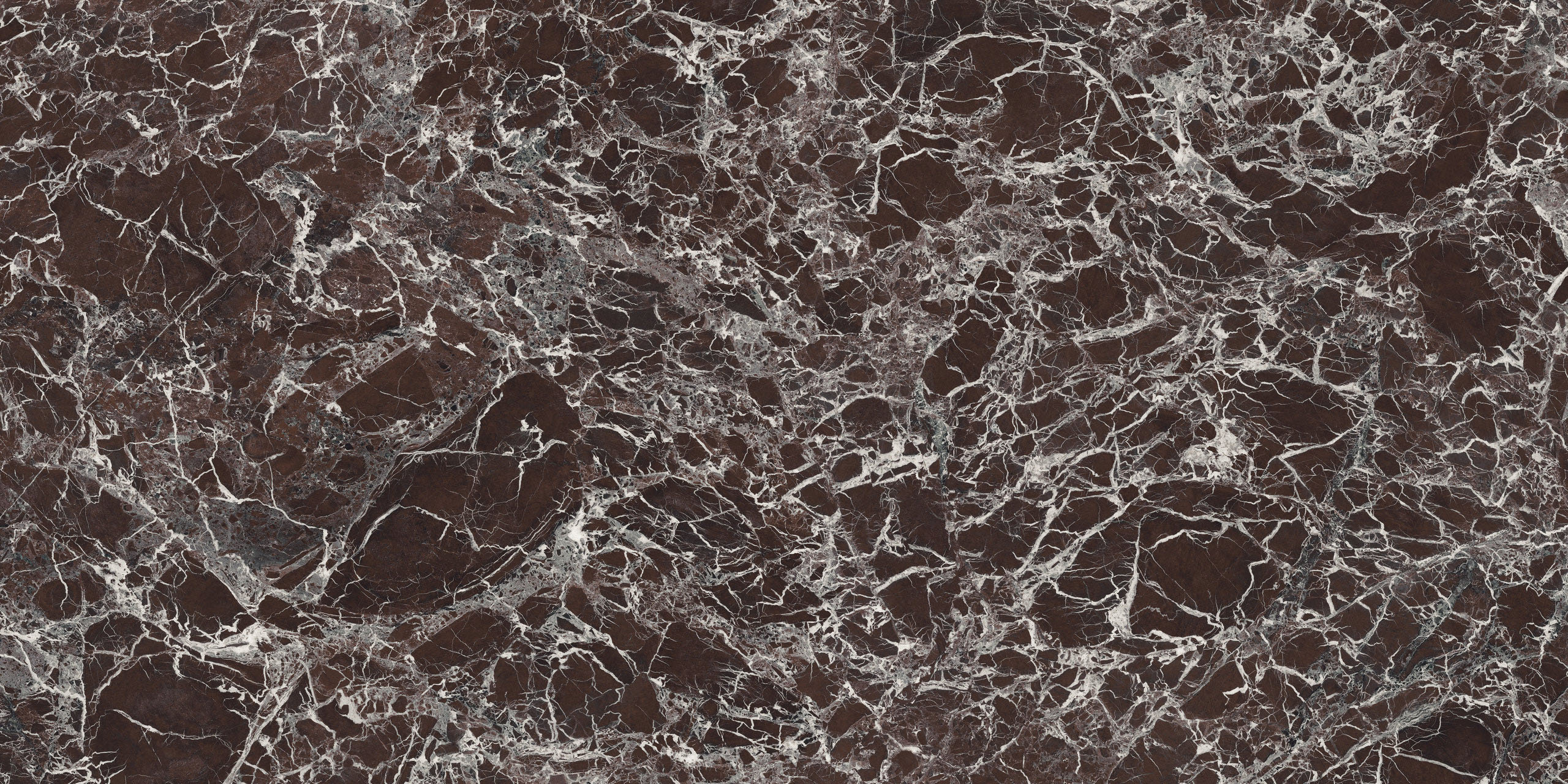 Il disegno brecciato si fa maestoso, imperiale: stende un reticolo fittissimo di venature lattee, sul manto tinto di porpora e bordeaux interrotto a volte da intrusioni scure, più fredde. L’opera minerale, nel suo rigore e imprevedibilità, sfoggia un’identità estetica uniforme e, al tempo stesso, infinitamente variabile.