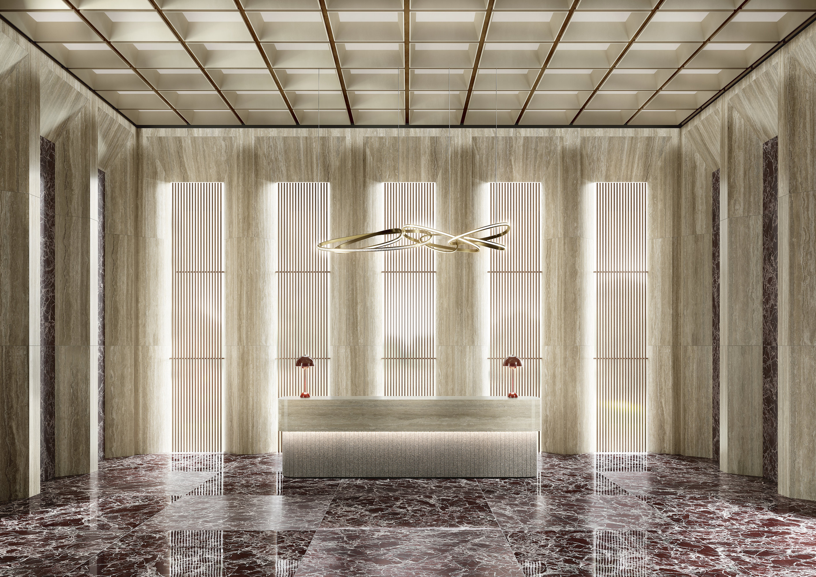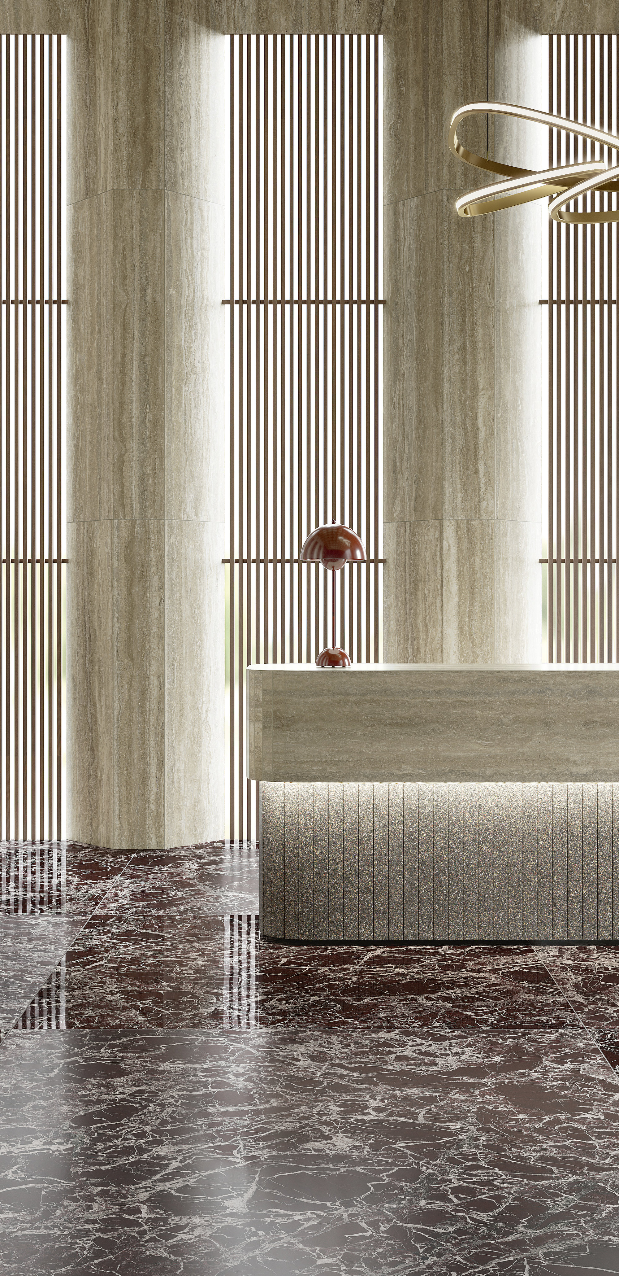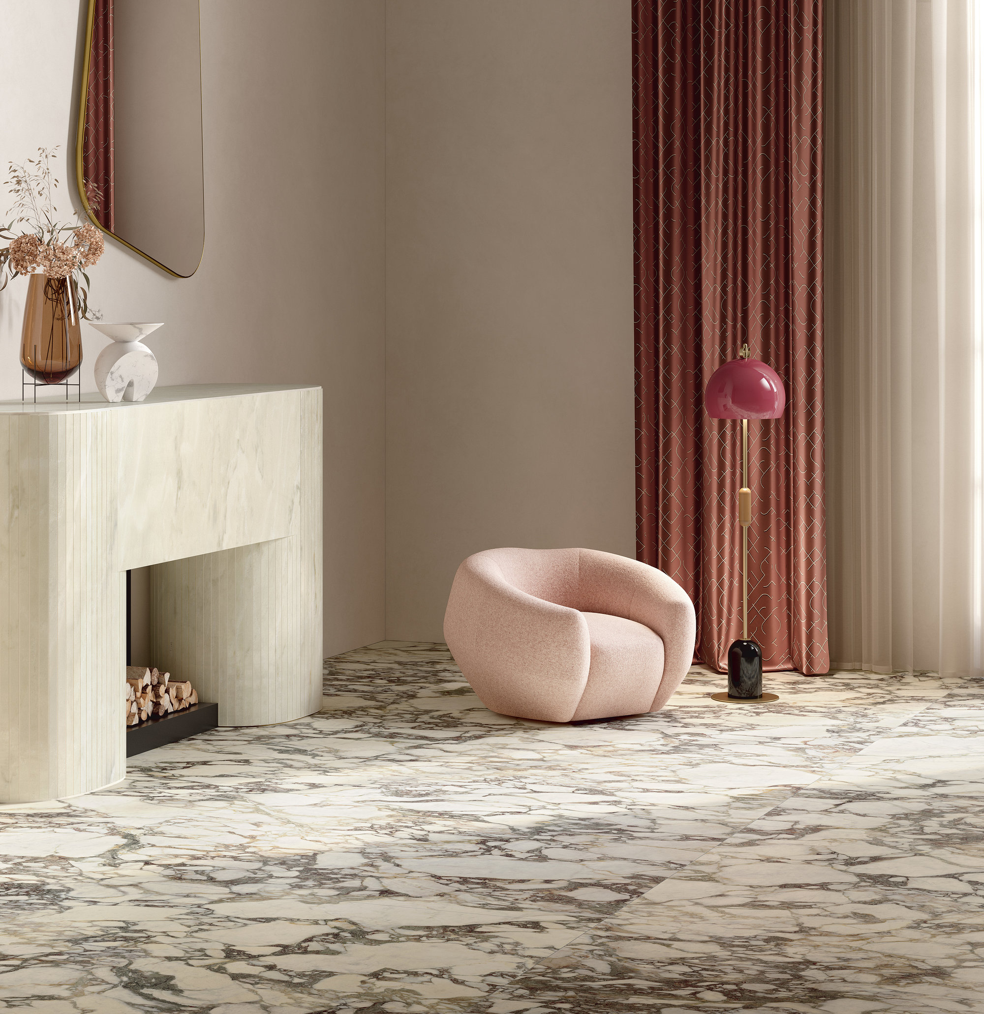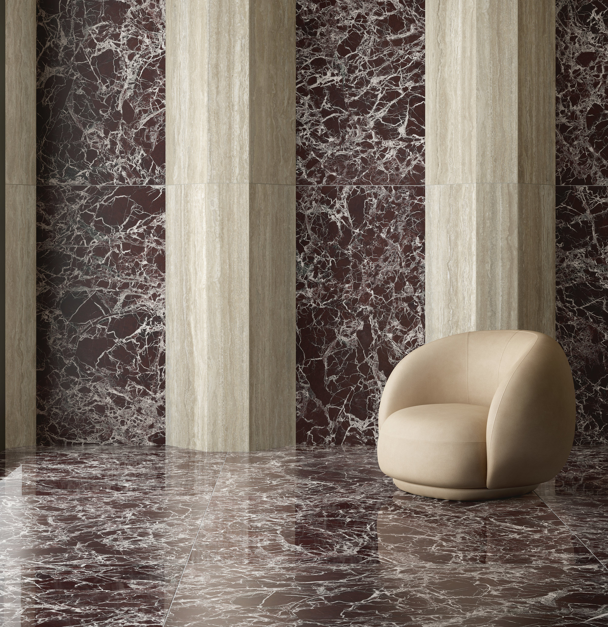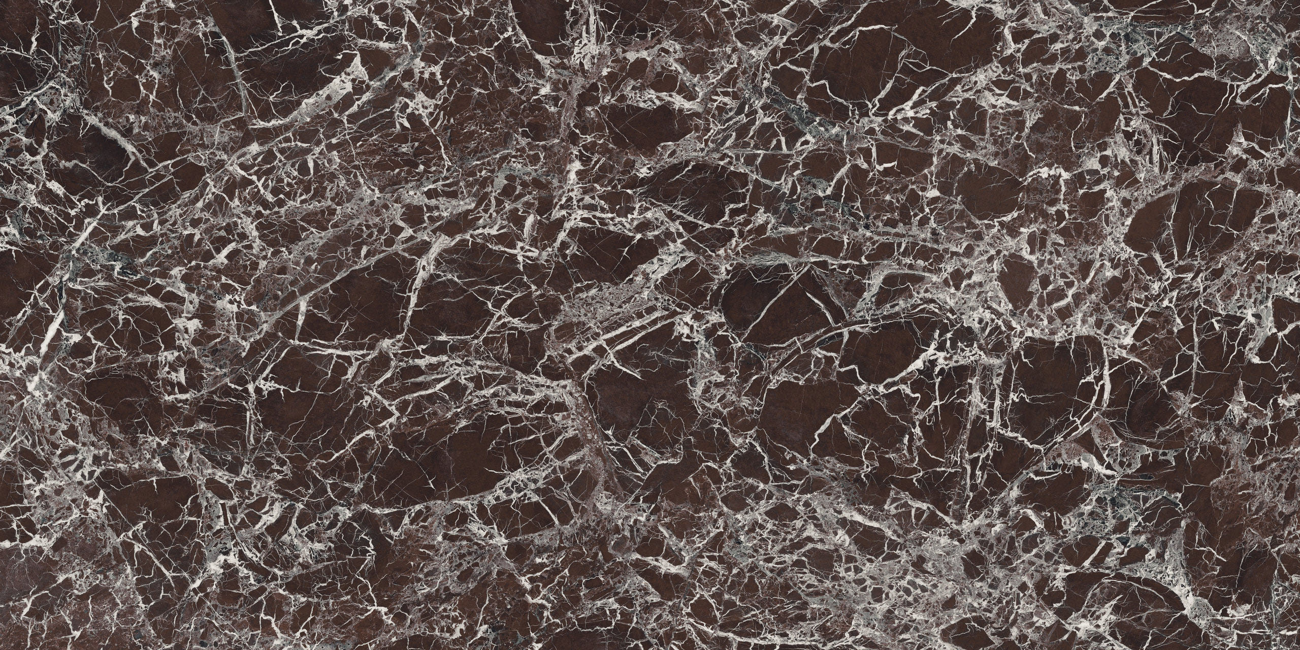 Il disegno brecciato si fa maestoso, imperiale: stende un reticolo fittissimo di venature lattee, sul manto tinto di porpora e bordeaux interrotto a volte da intrusioni scure, più fredde. L’opera minerale, nel suo rigore e imprevedibilità, sfoggia un’identità estetica uniforme e, al tempo stesso, infinitamente variabile.