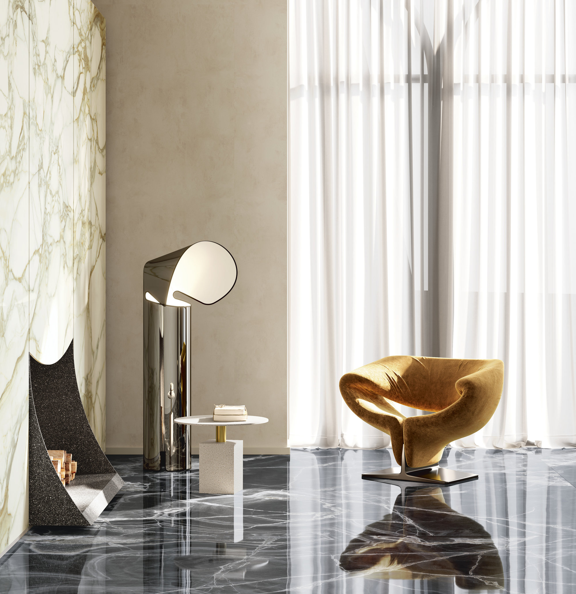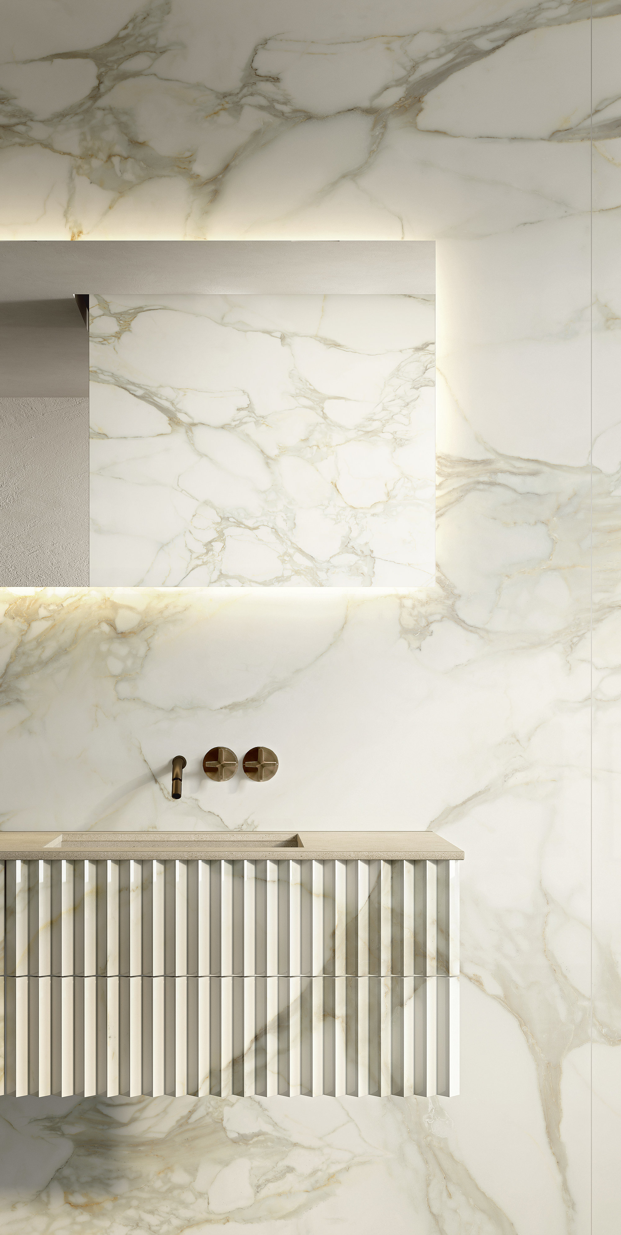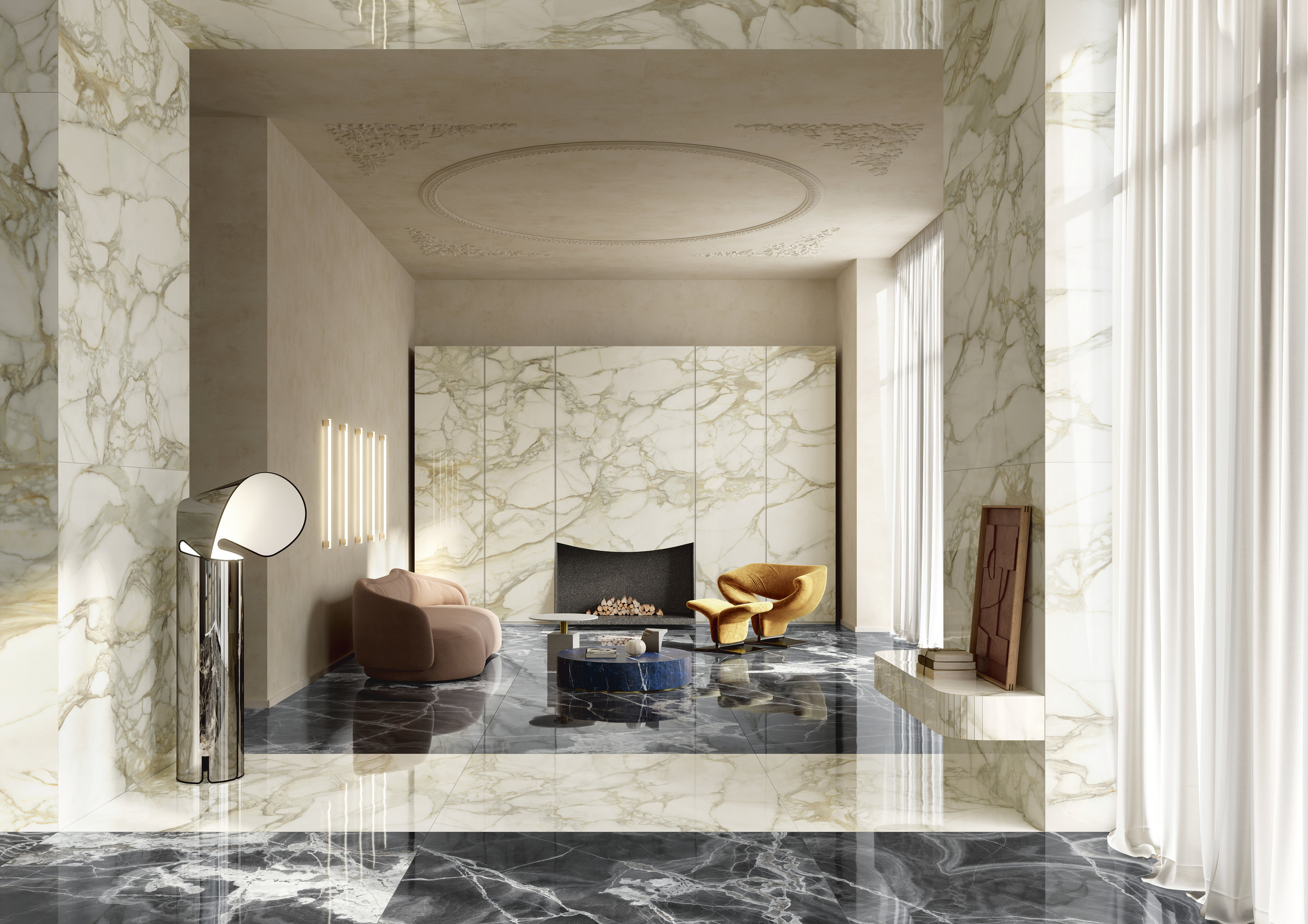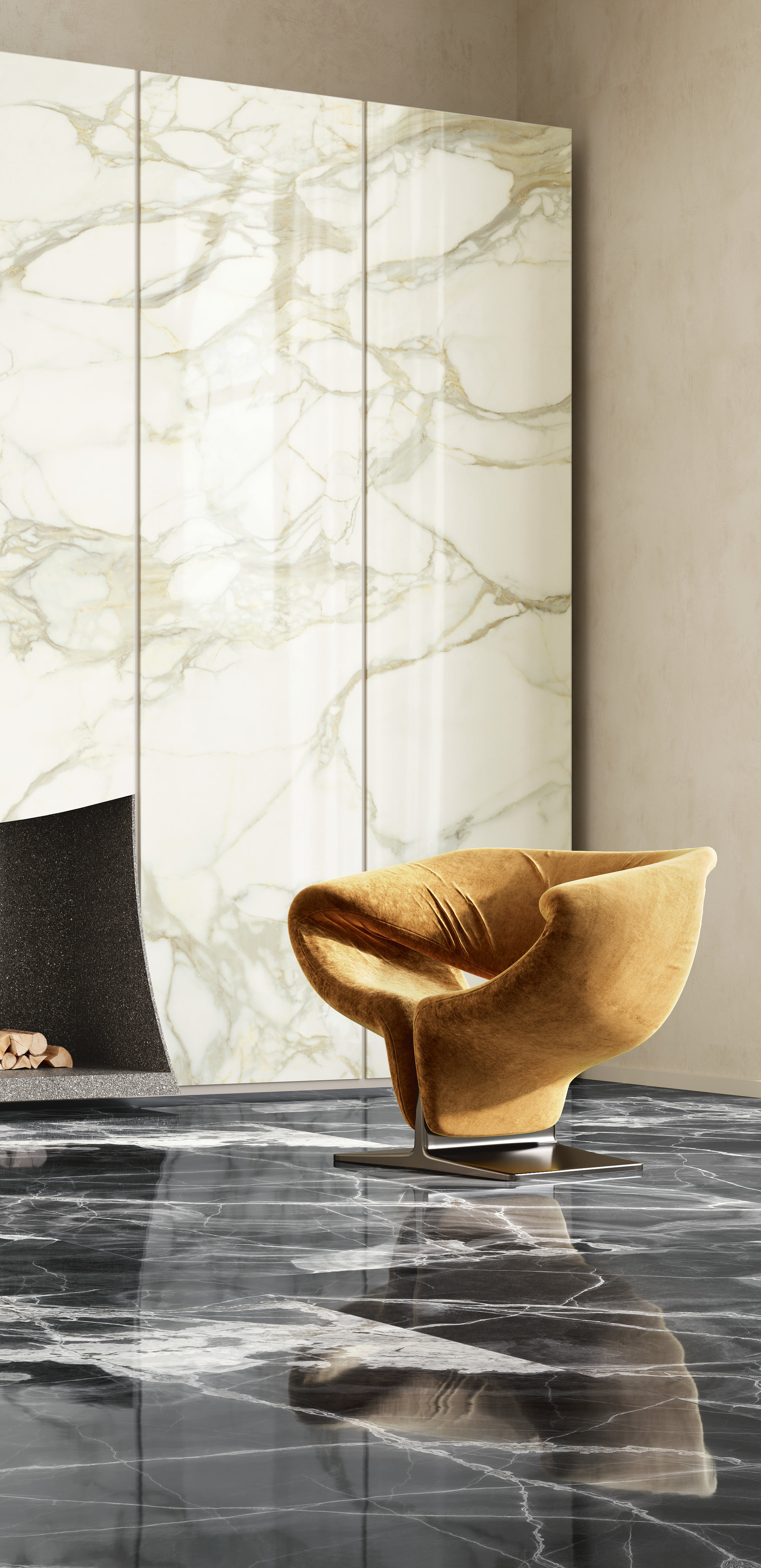 Calacatta Dorato cattura l'attenzione con venature dorate, profonde e sinuose, capaci di conferire calore, movimento e raffinatezza agli spazi. Questa superficie ceramica si presta per impreziosire residenze private, progetti commerciali e strutture hospitality, dove il pregio del design non deve scendere a compromessi con funzionalità, resistenza e facilità di manutenzione delle superfici. La finitura Polished dona luminosità e brillantezza alla texture mentre la finitura Natural conferisce un aspetto opaco e più contemporaneo. Disponibile nei formati classici e Maximum.