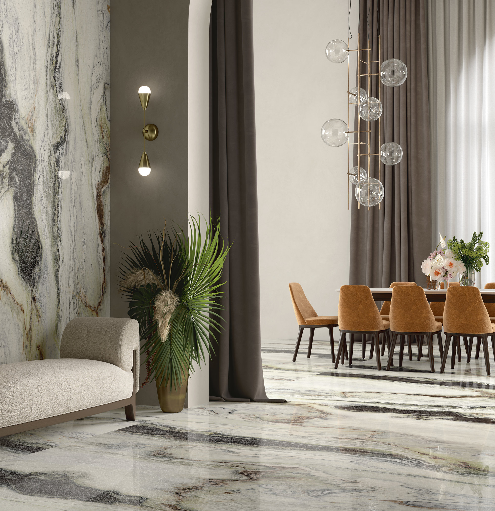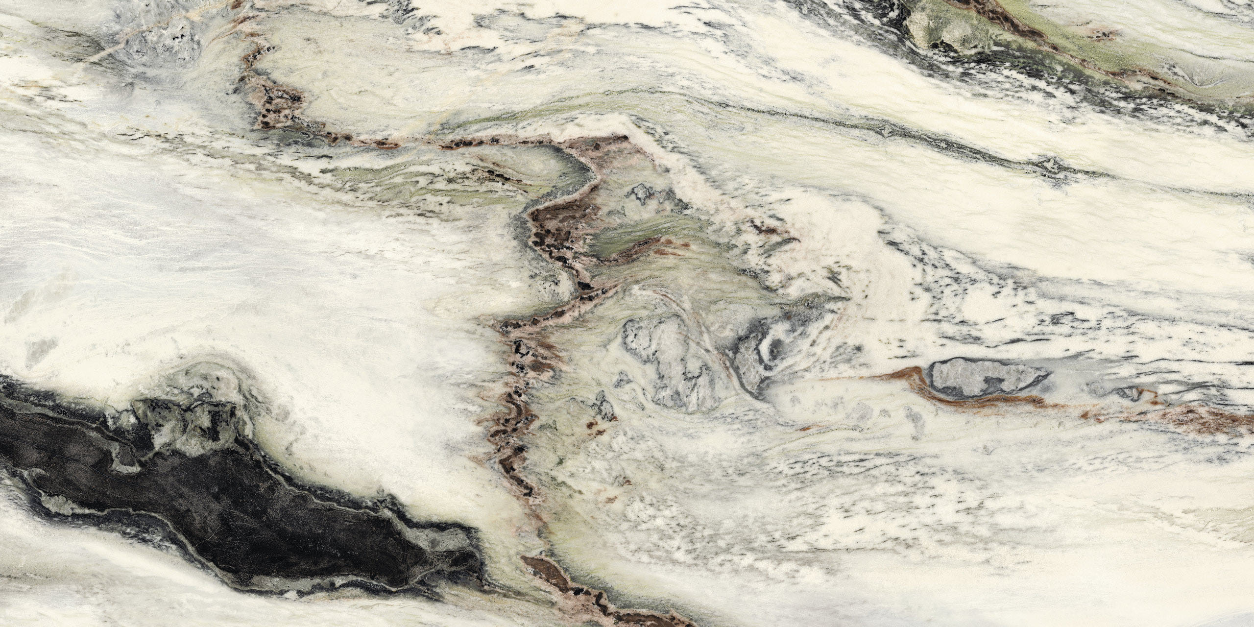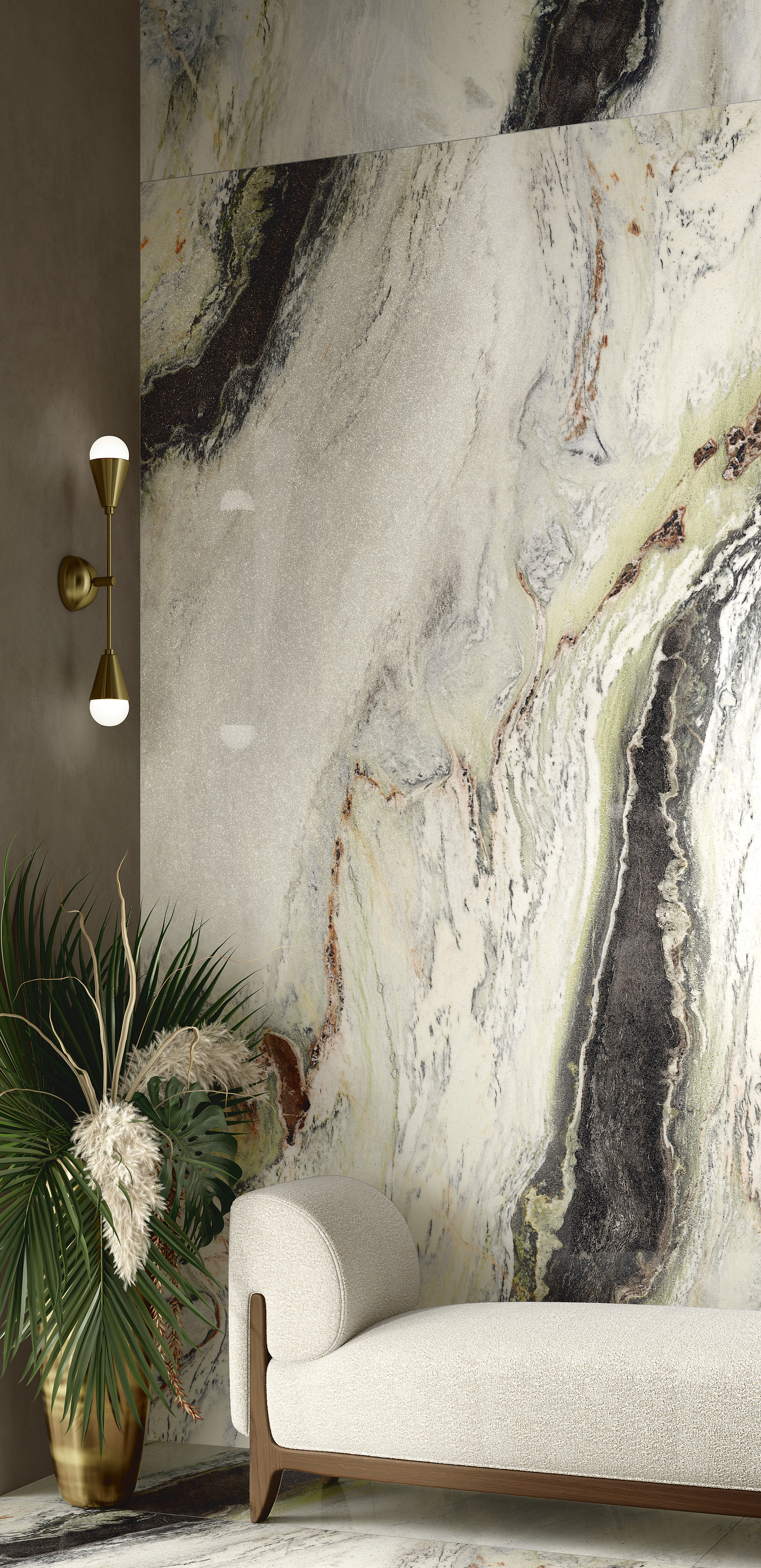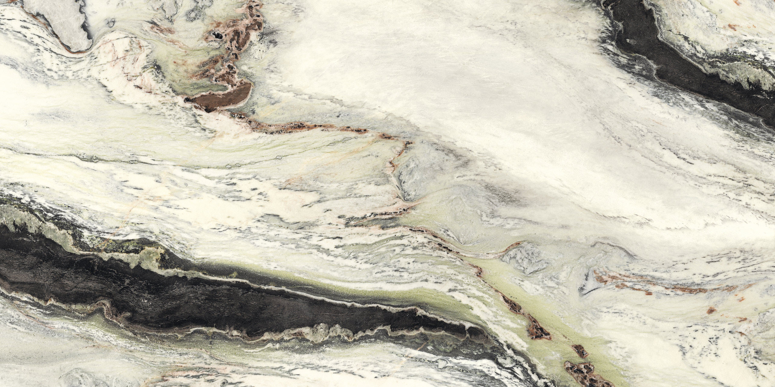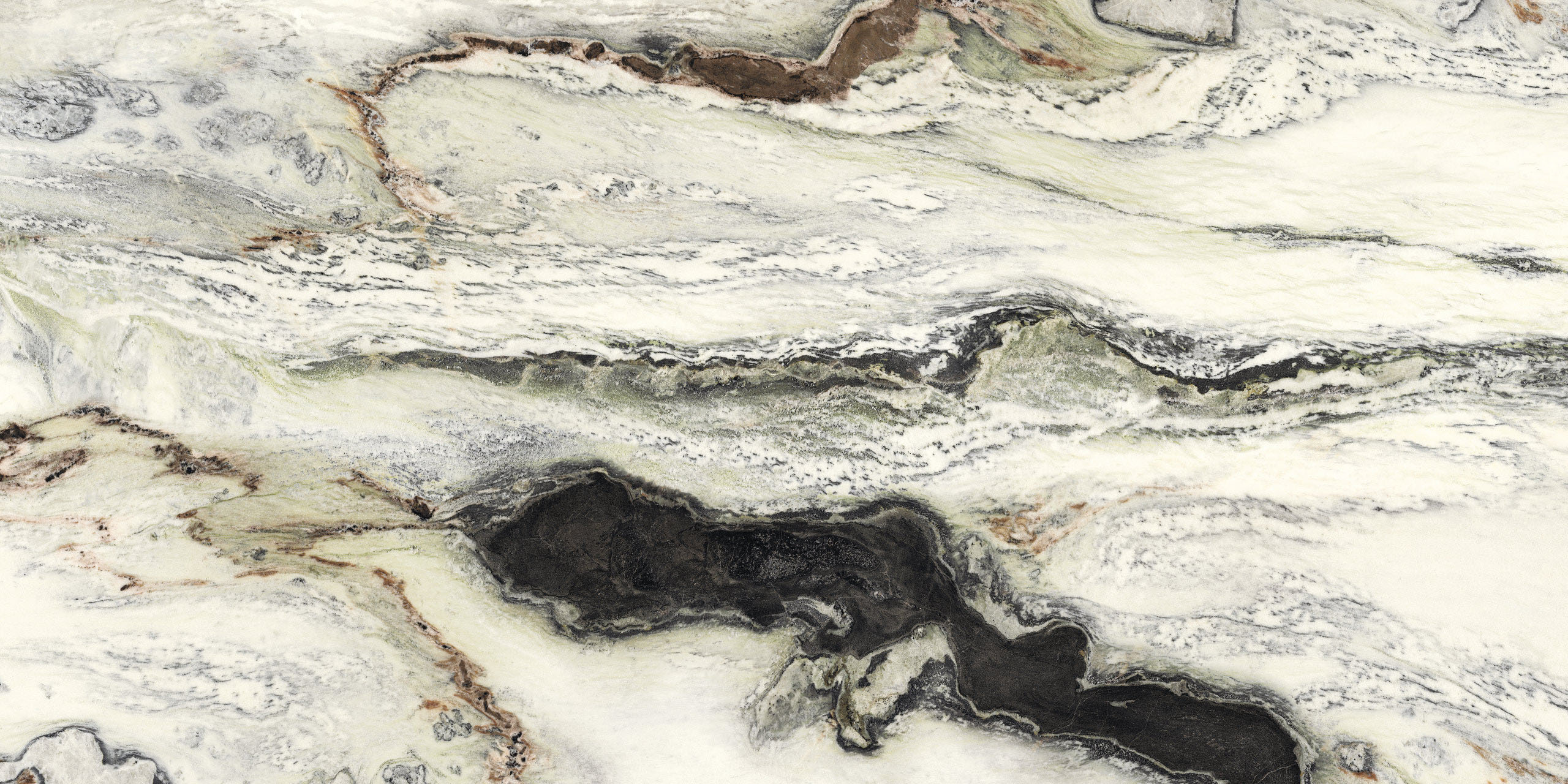 Si presenta con venature sinuose e morbide increspature che animano di colore il fondo candido. La tonalità piena del nero e delle sue innumerevoli gradazioni creano una trama ad onde, intervallata da tenui inserti di colore verde e amaranto. La nuova finitura glint esalta il contrasto cromatico aggiungendo alla superficie lucida preziosissimi giochi di luce.