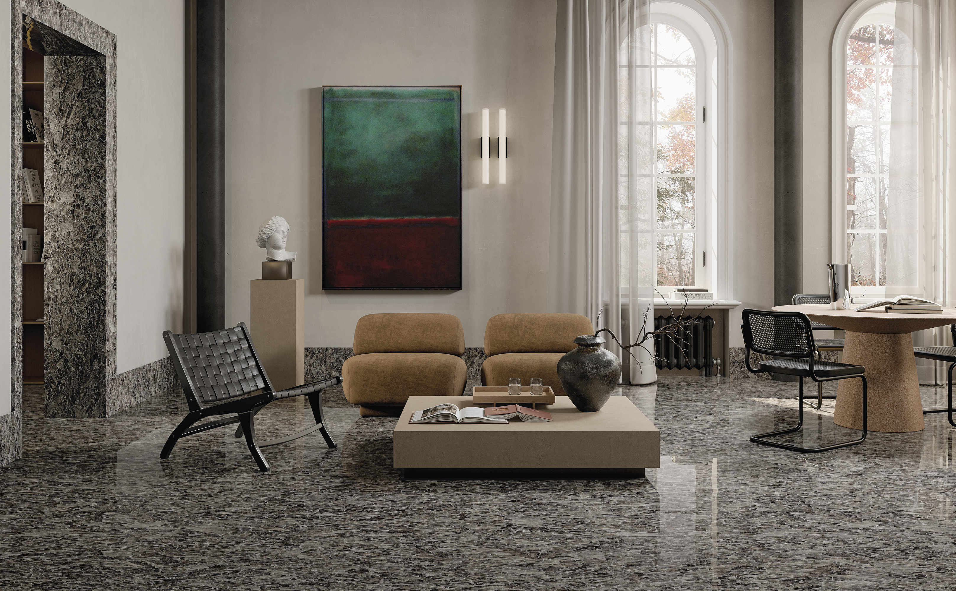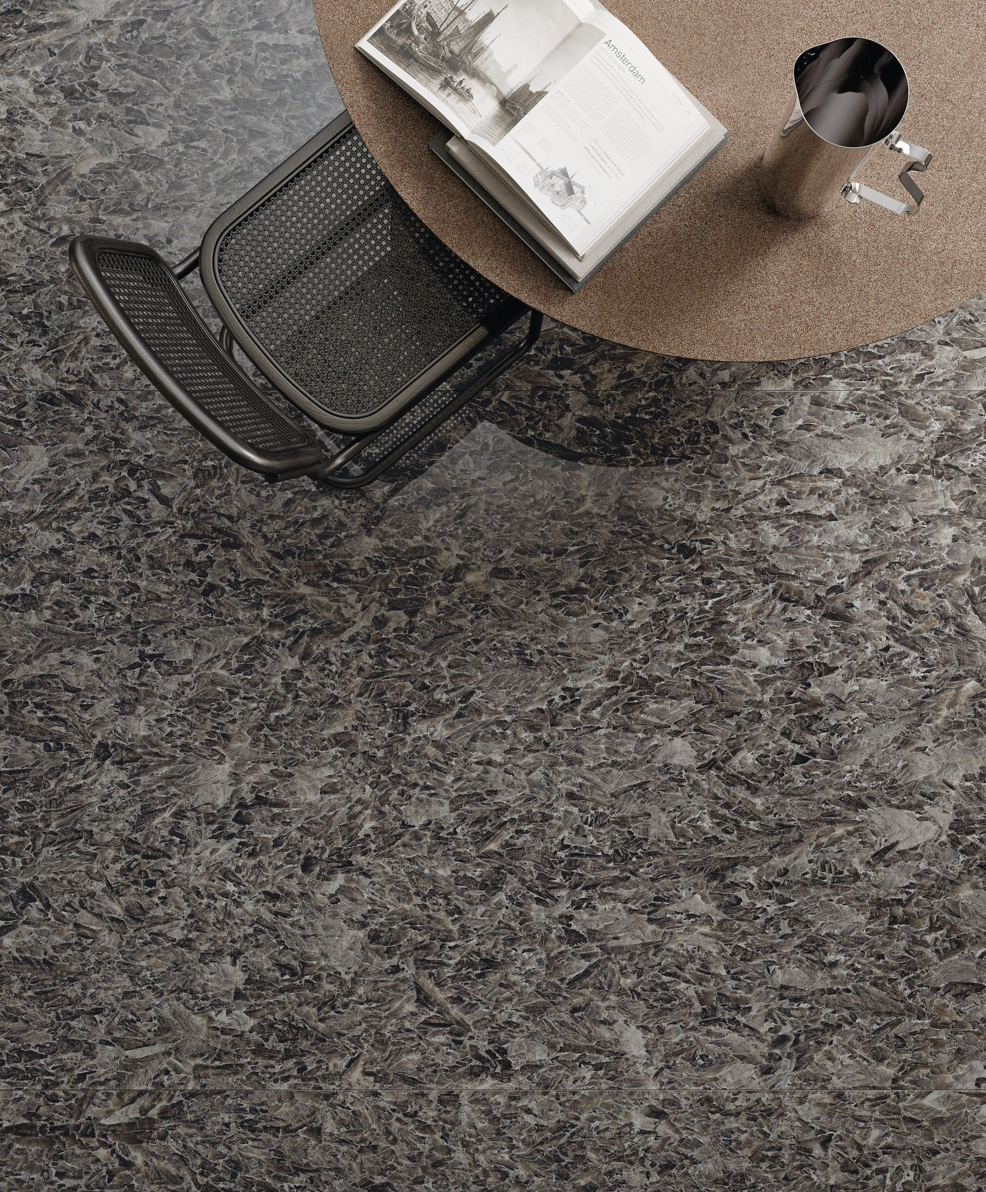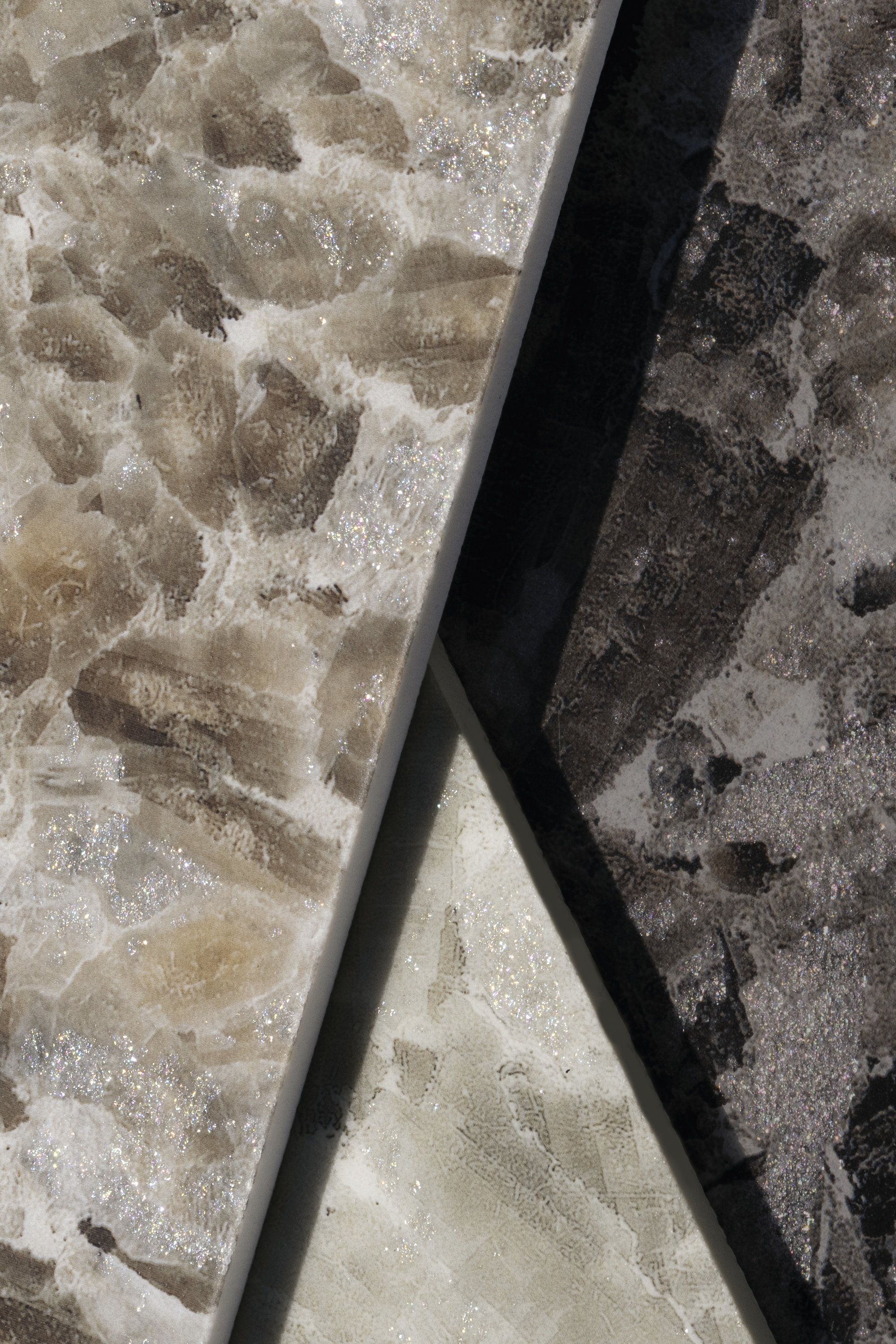 Il nero si illumina di inserti più chiari e sfumati, trasmettendo eleganza agli spazi e un tocco di rigore. Visivamente avvolgenti grazie alle rifrazioni cristalline, le superfici sorprendono per i tratti grafici, mentre l’esclusiva finitura Jewel, grazie a un’intesa alchemica tra un minerale iridescente e un materiale vetroso, enfatizza i frammenti luminosi e dona un effetto ancora più nitido e intenso alla materia ceramica, suggerendo un’esperienza architettonica emozionale.
