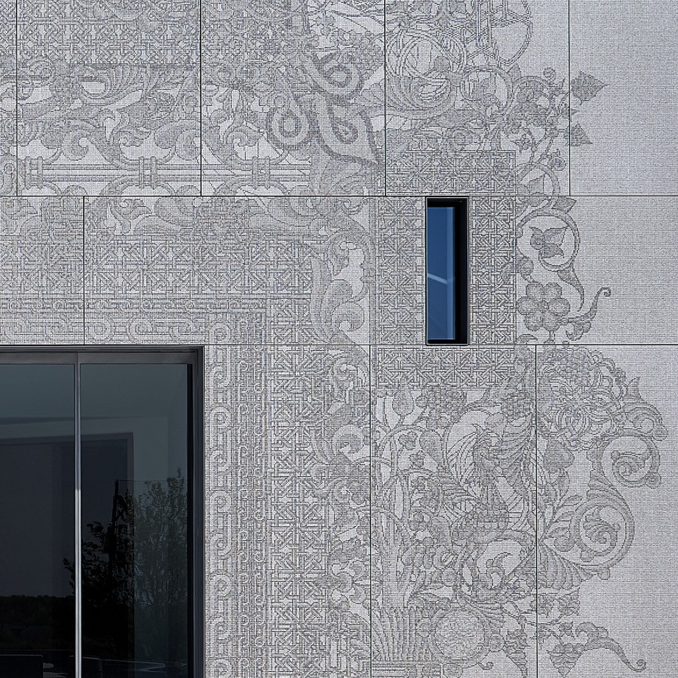 Cuore del progetto di St. Sarkis è la facciata che rappresenta un grande traguardo per Iris Ceramica Group, in quanto primo caso d’impiego di una tale tecnologia di stampa digitale ad altissima definizione per esterni che va a coinvolgere otticamente l’osservatore in una serie di scale visive annidate le une dentro le altre.