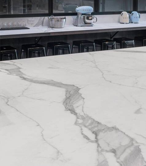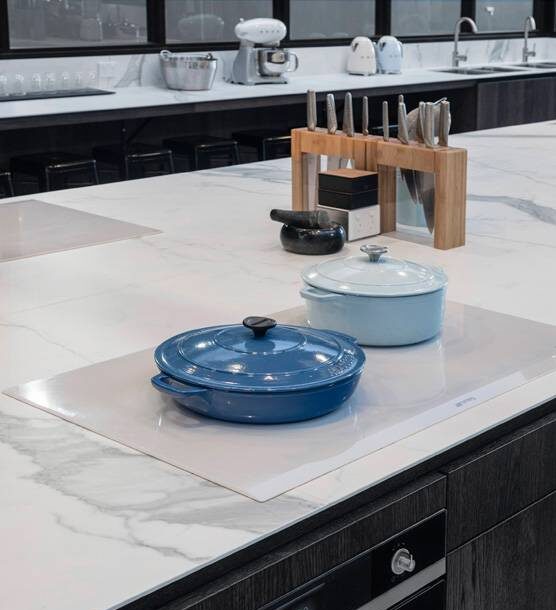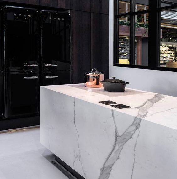 Questa elegante cucina ad isola è stata realizzata con le pregiate superfici ceramiche Fiandre Calacatta Statuario Maximum, creando un ambiente raffinato e contemporaneo. Il piano ad induzione integrato è perfettamente incorniciato dalla ceramica, che garantisce una superficie liscia, resistente e di facile manutenzione.