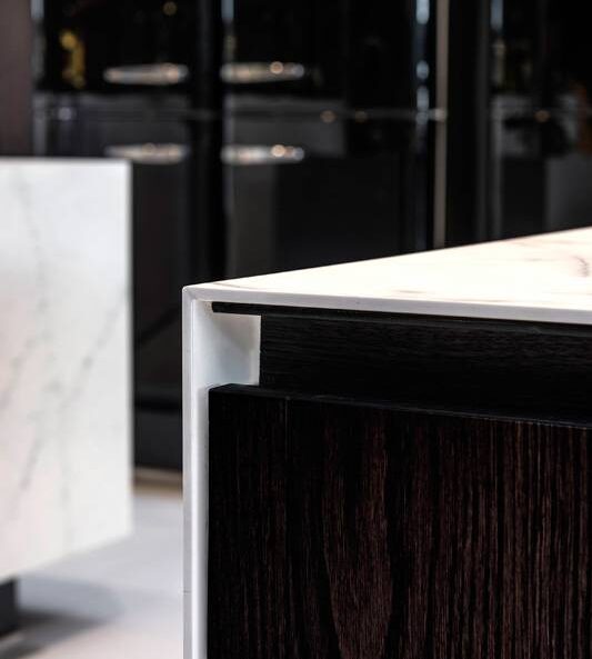 Le caratteristiche uniche delle ceramiche Fiandre emergono chiaramente: la lavorabilità dei materiali permette di ottenere angoli perfettamente rifiniti e giunzioni invisibili, mentre la possibilità di disporre le lastre in modo da creare una venatura continuativa trasforma il piano in un vero e proprio elemento di design, armonico e scenografico.