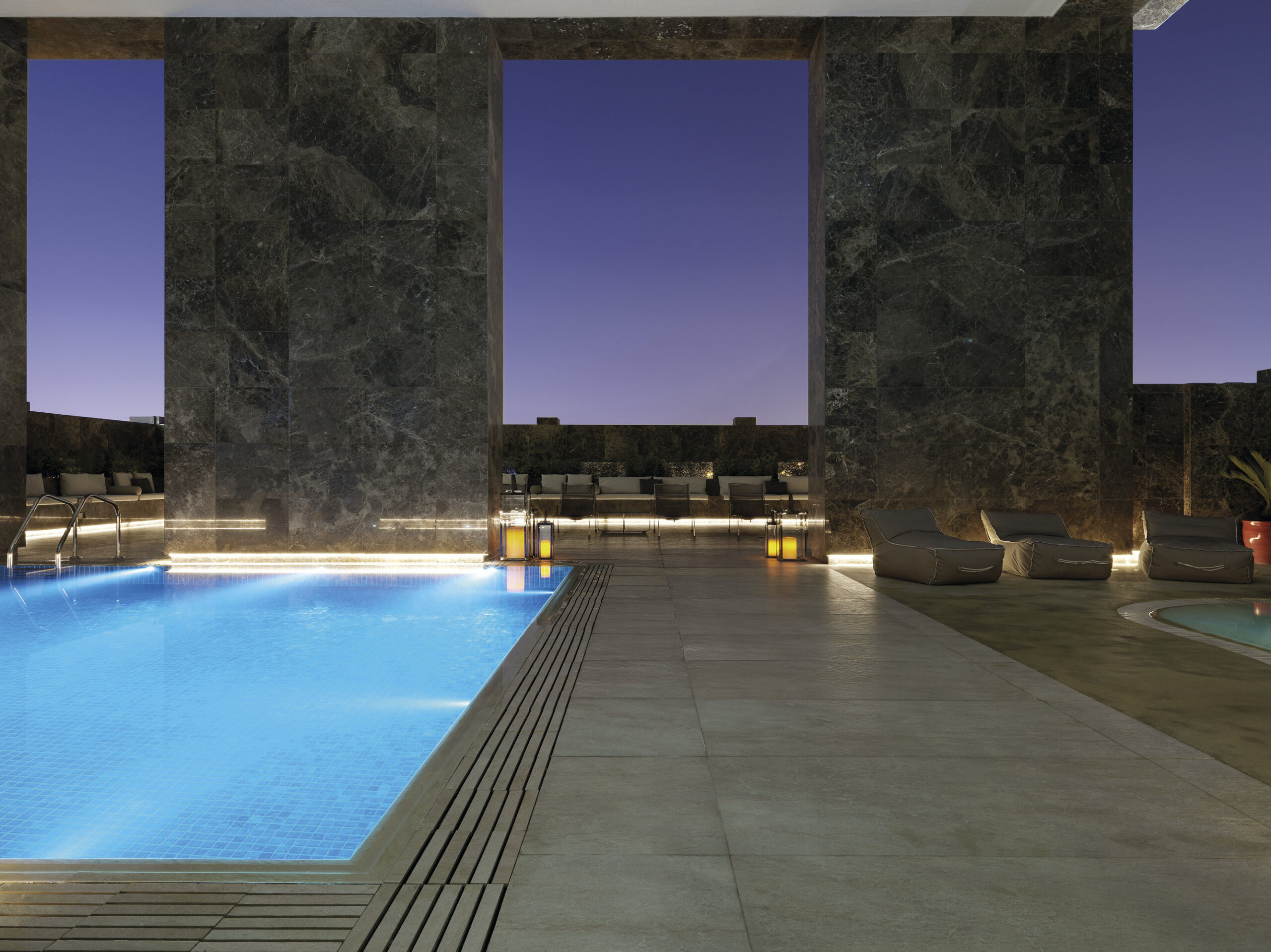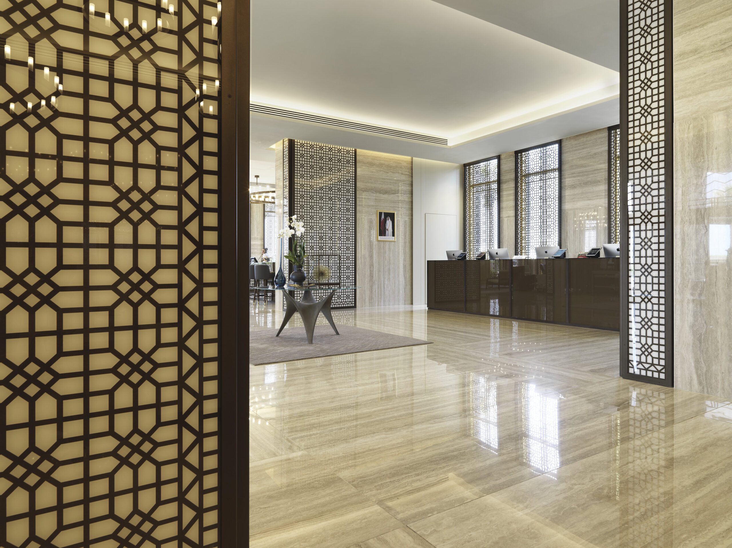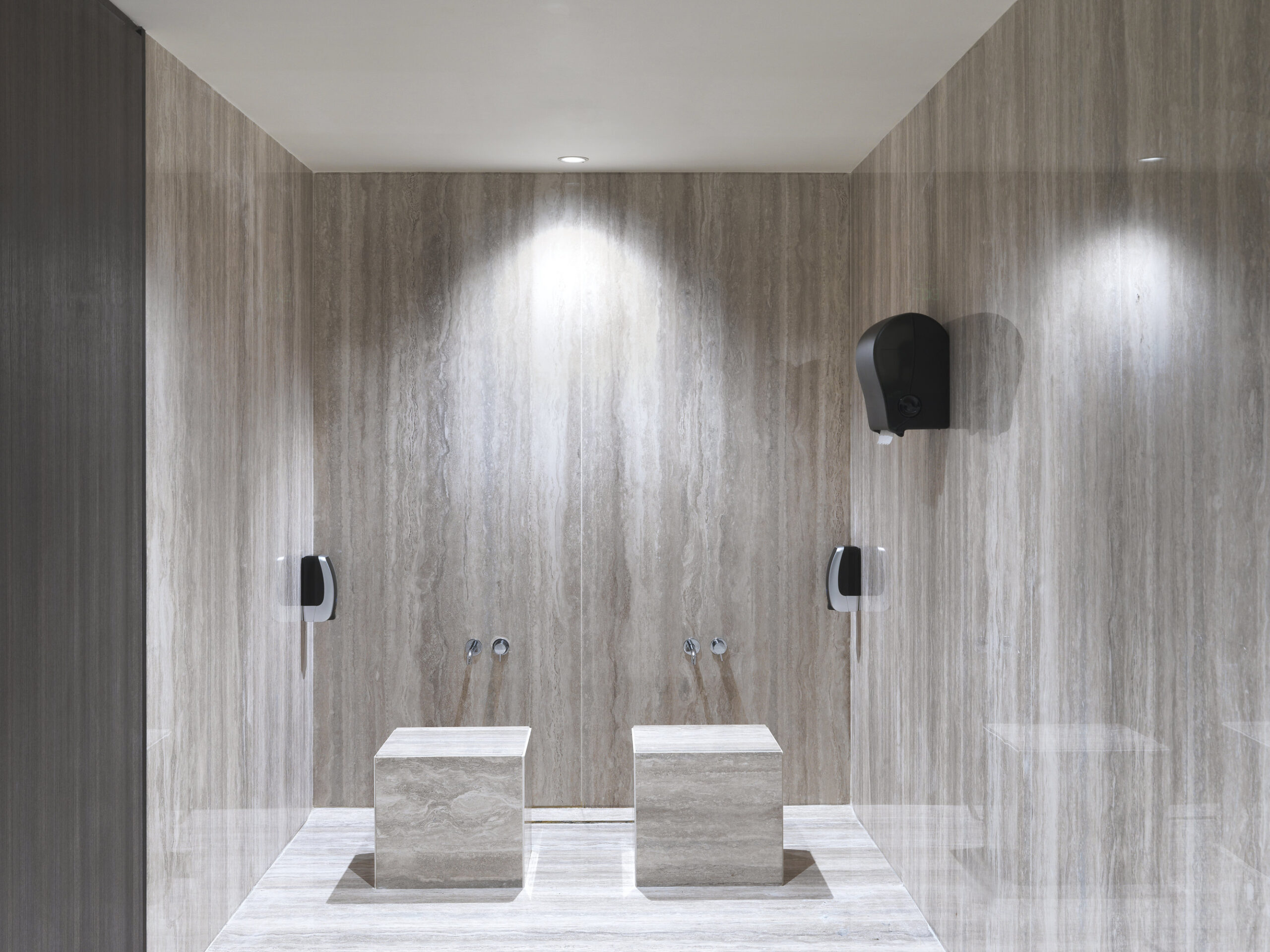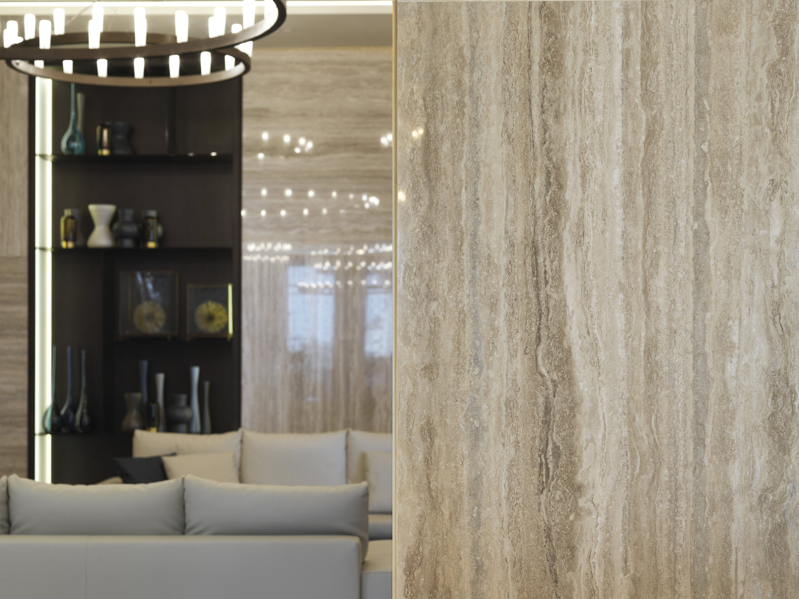 Le lastre Marmi Maximum (300×150 cm, spessore 6 mm) in gres porcellanato rivestono lobby, ristoranti e lounge. Travertino Maximum dona alla lobby tonalità calde ispirate alla sabbia del deserto, Calacatta Maximum esalta la luminosità dei ristoranti, mentre Gold Onyx Maximum aggiunge esclusività alla lounge al 32° piano. Il grande formato riduce le fughe, amplifica gli spazi e garantisce continuità visiva.