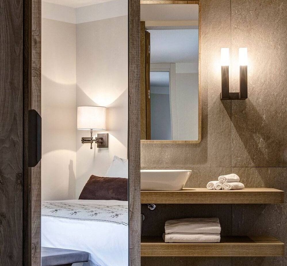 La hall e le aree comuni sono ambienti luminosi e scenografici, caratterizzati da grandi vetrate che incorniciano il paesaggio alpino. Le camere e le suite offrono spazi intimi e raffinati, dove il comfort si unisce a dettagli di design personalizzati. Il ristorante e il lounge bar sono concepiti per creare atmosfere calde e conviviali, con arredi che richiamano la tradizione reinterpretata in chiave contemporanea. Infine, l’area wellness è progettata come un’oasi di benessere, con materiali naturali e linee essenziali pensate per favorire il relax assoluto.