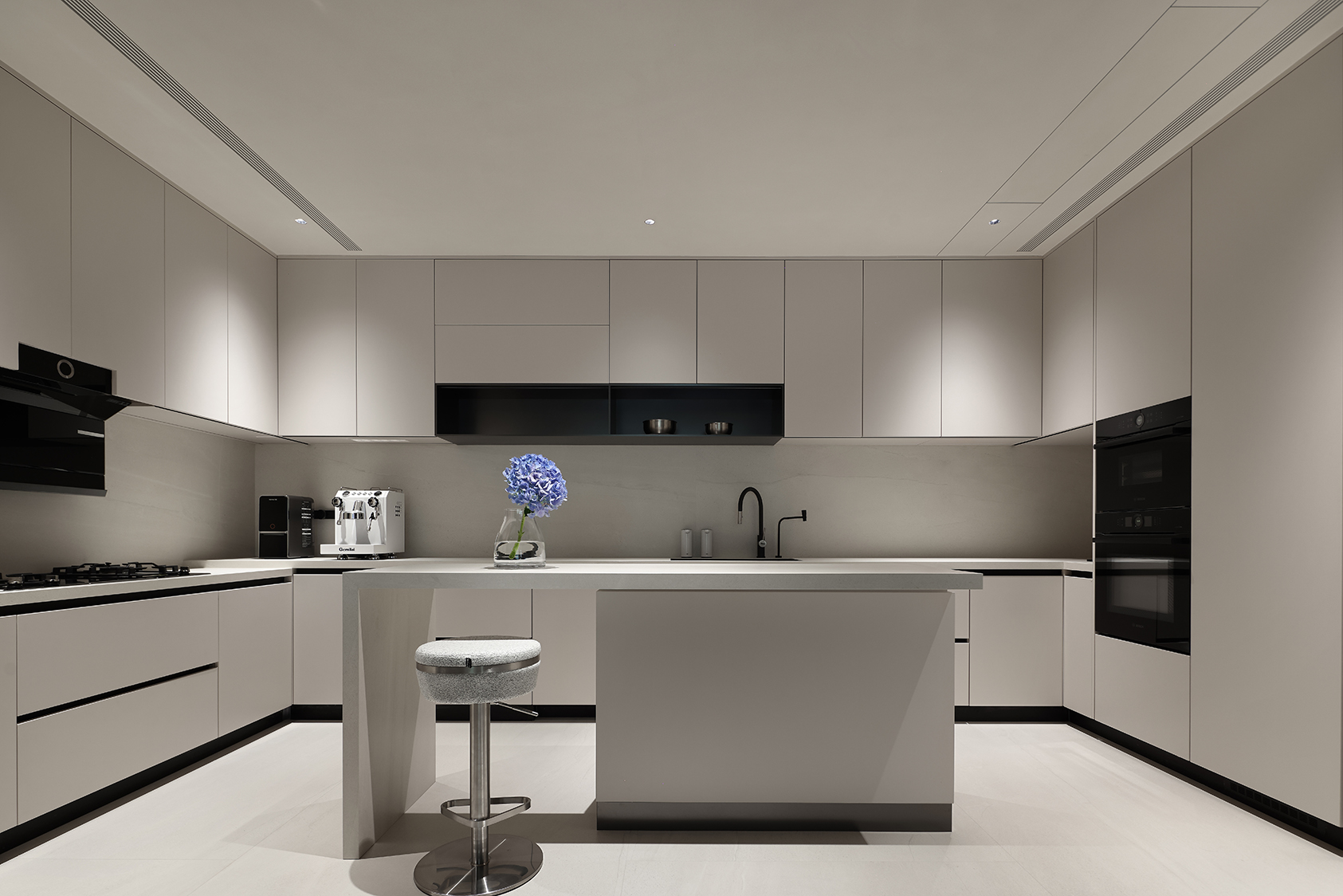 In cucina, il materiale riveste il piano di lavoro, i pensili e il rivestimento back-splash, garantendo la massima continuità estetica, in dialogo con l’architettura degli spazi. Questa scelta progettuale contribuisce a rafforzare la percezione di uniformità e pulizia formale, esaltando al tempo stesso l’igienicità e la praticità d’uso delle superfici.